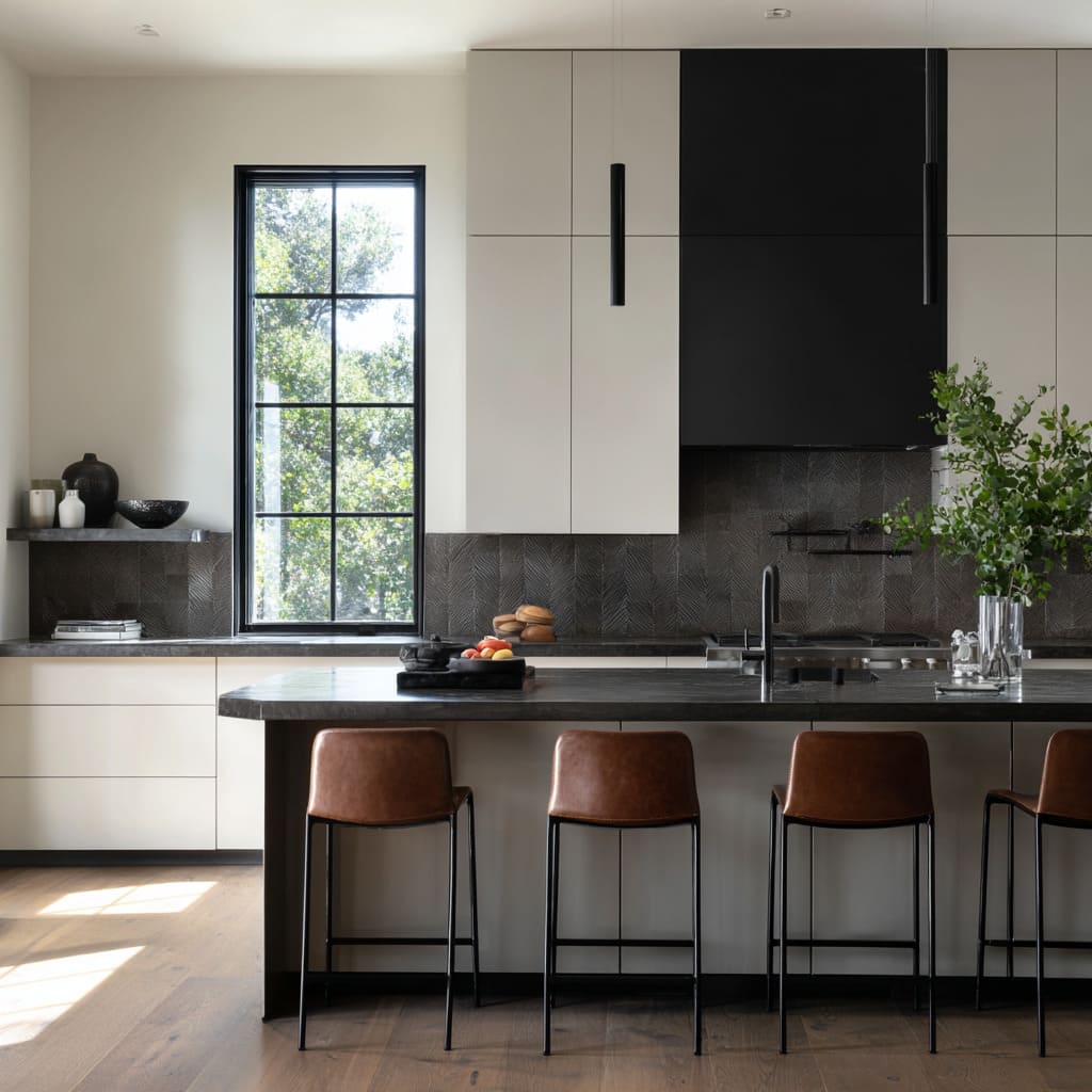 A subtle but powerful strategy sits in the upper half of the room: when the backsplash tone sits close to the ceiling and adjacent soffit fields, the number of color events above eye level drops. Dark cabinetry, black-framed glazing, and stone counters then read sharper and more deliberate because they sit inside a controlled envelope rather than competing against multiple contrasting wall moments.