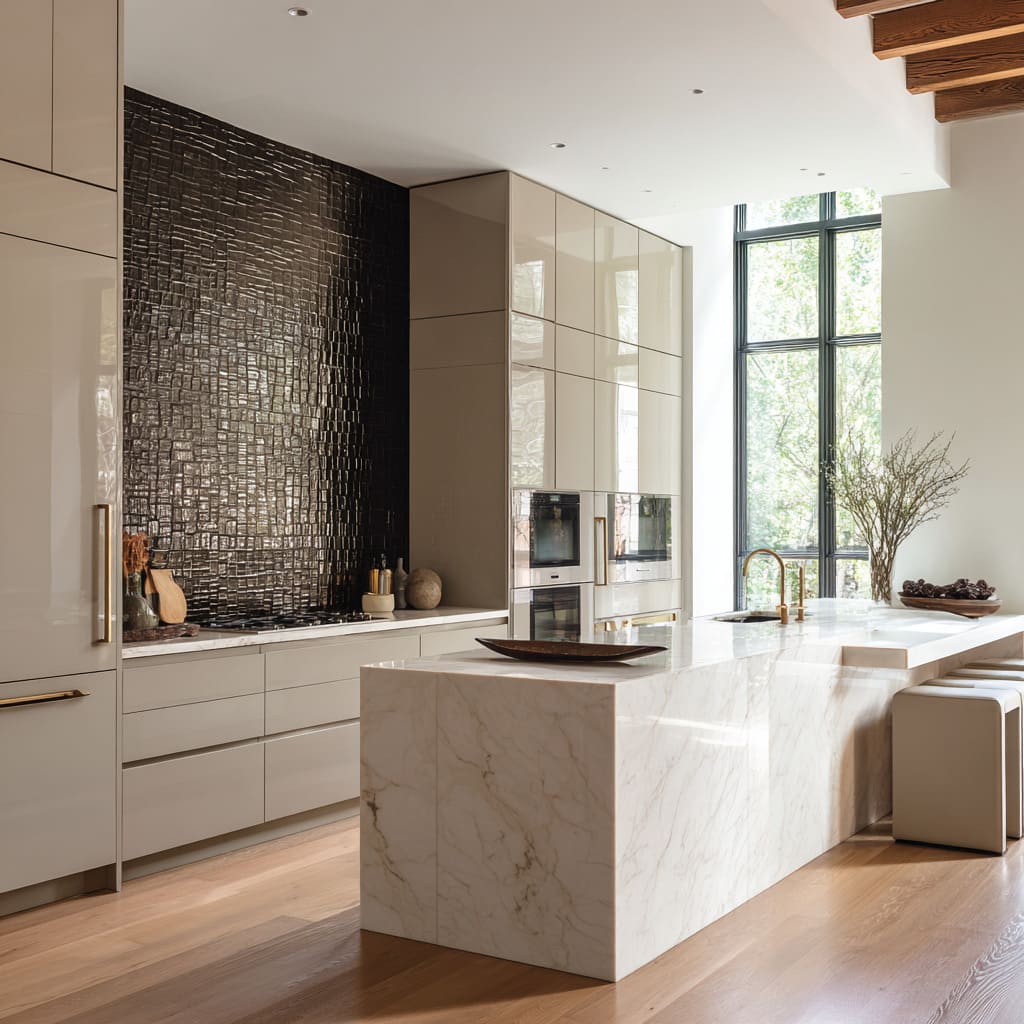 This is where kitchen backsplash design becomes a mood-setting device: the wall is treated like a primary visual plane with its own hierarchy rules, and everything nearby supports that hierarchy through scale and restraint.