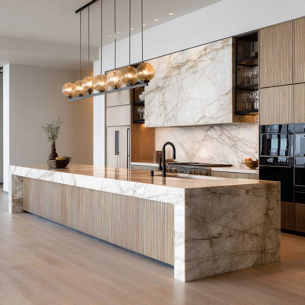 Dramatic veined stone slab backsplash design with a wrapped monument, paired with ribbed wood to make the stone feel even more luminous.jpg