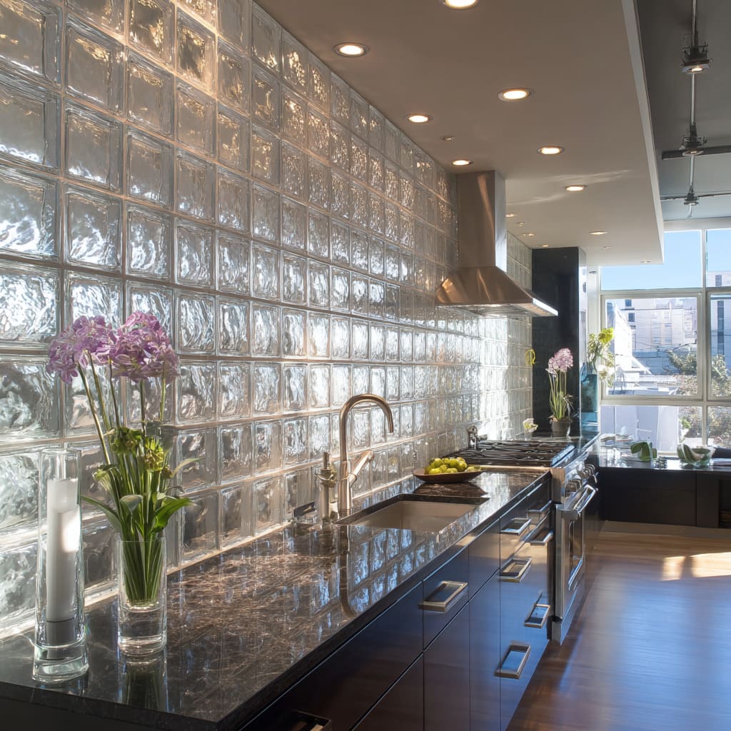 Glass-block grid backsplash idea used like liquid daylight, turning the wall into a bright, soft-moving surface.jpg