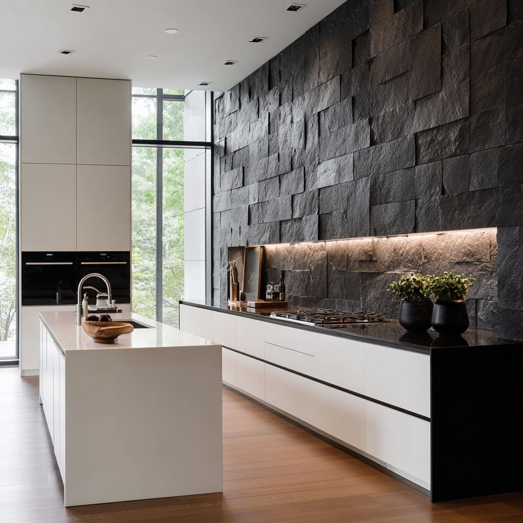 Dark relief backsplashes can create depth while remaining sophisticated when the surface stays close in value to nearby dark elements (hoods, counters, window frames). In that case, the wall behaves as a grounded base line that stabilizes taller light cabinetry and prevents the upper volume from feeling overly blank.