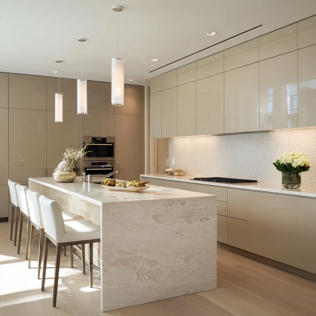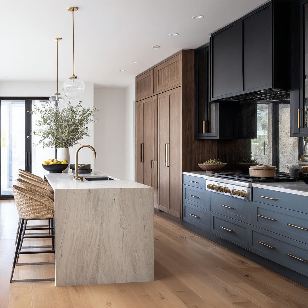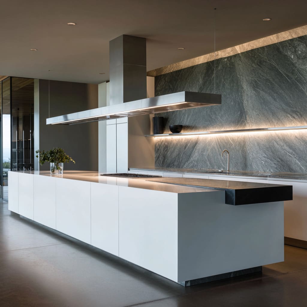 • In slab-panel kitchens, stone movement carries the content.