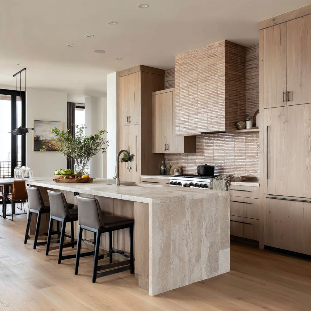 Stone slabs with strong directionality (especially vertical movement) can counterbalance the kitchen’s horizontal emphasis—long islands, drawer runs, floor planks—so the range wall gains authority without extra decoration. Warm stacked tile wrapped over the hood can create a clay-like block effect: subtle striations introduce rhythm, while continuity reads as architecture.