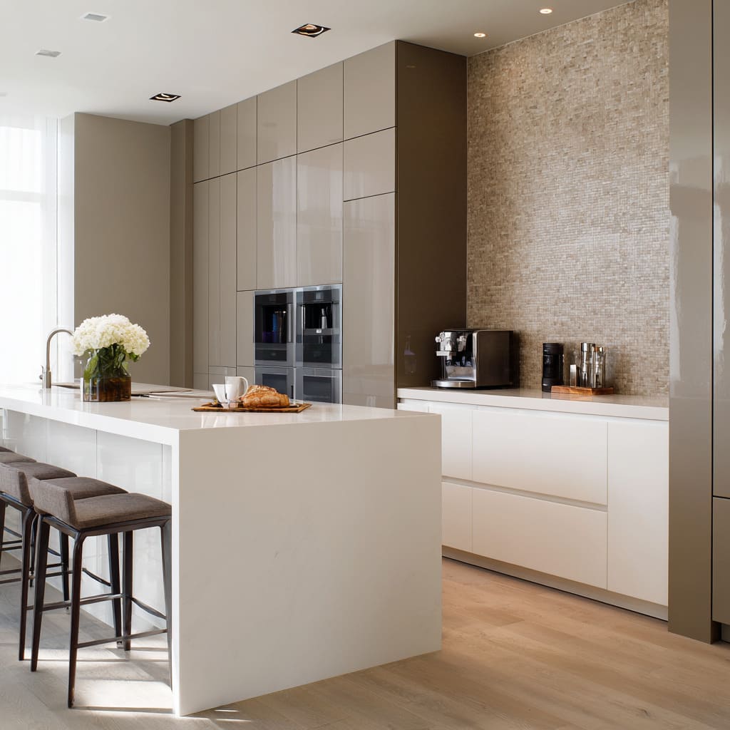 backsplash ideas with soft gold noise feeling, giving glossy cabinetry a grounded, human feel.jpg