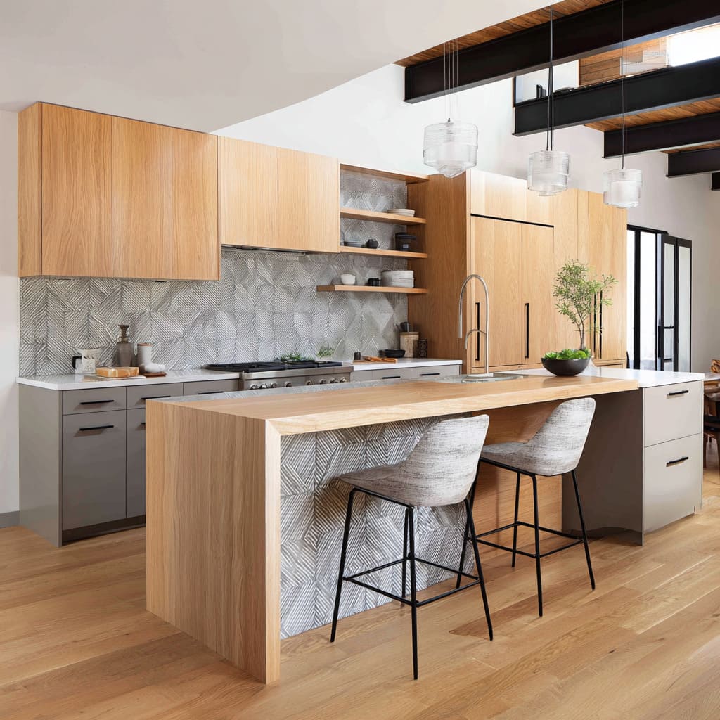 chevron relief backsplash design that organizes a mixed-material kitchen by giving it one consistent pulse.jpg