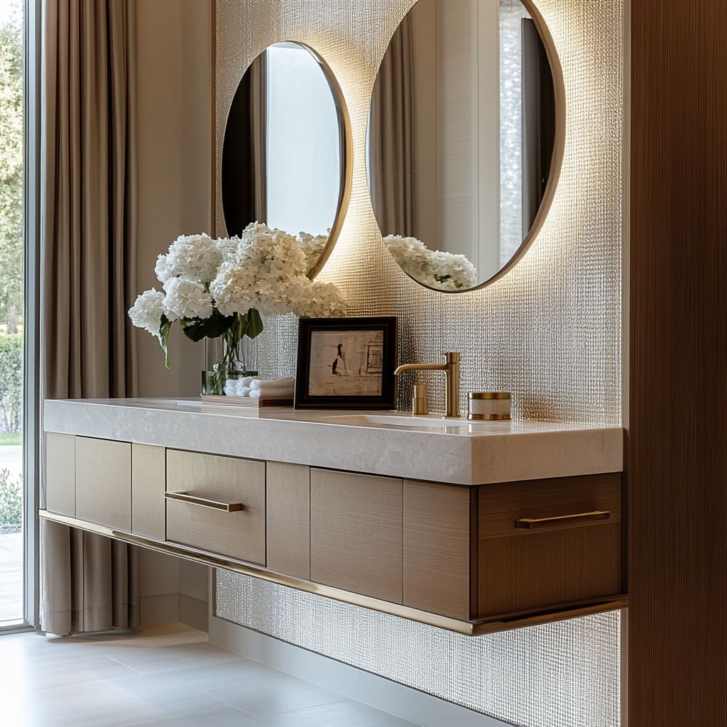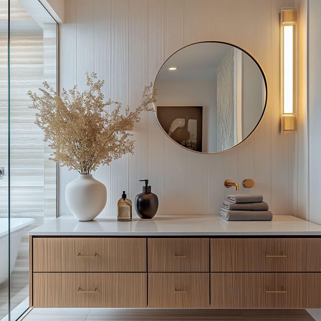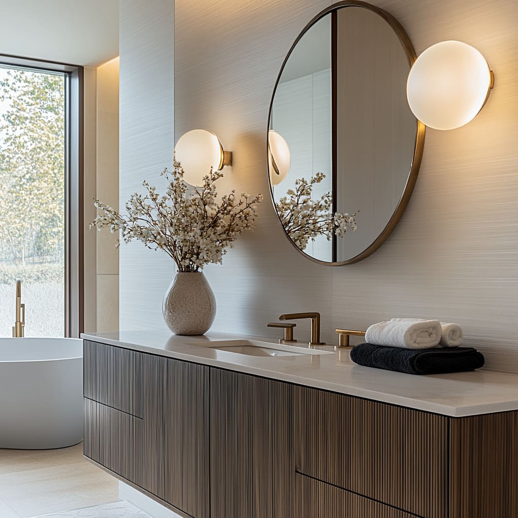 Such bathrooms can use curved shapes as a counterbalance to the vanity’s linear structure. Round mirrors, oval sconces, soft-edge counters, and curved basins bring a quiet gentleness to the layout.
