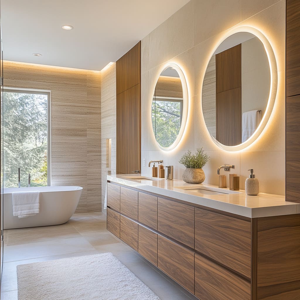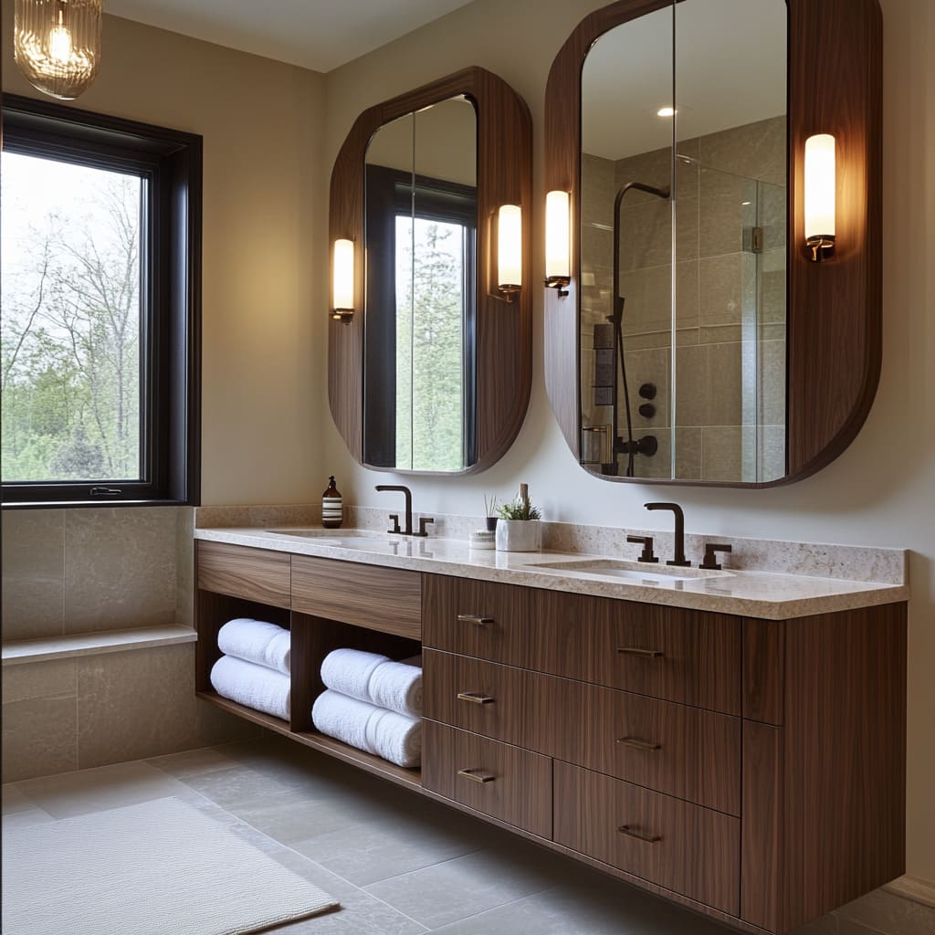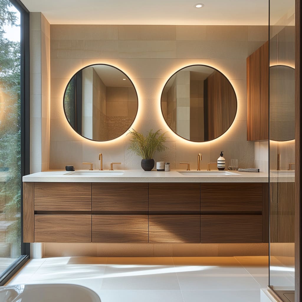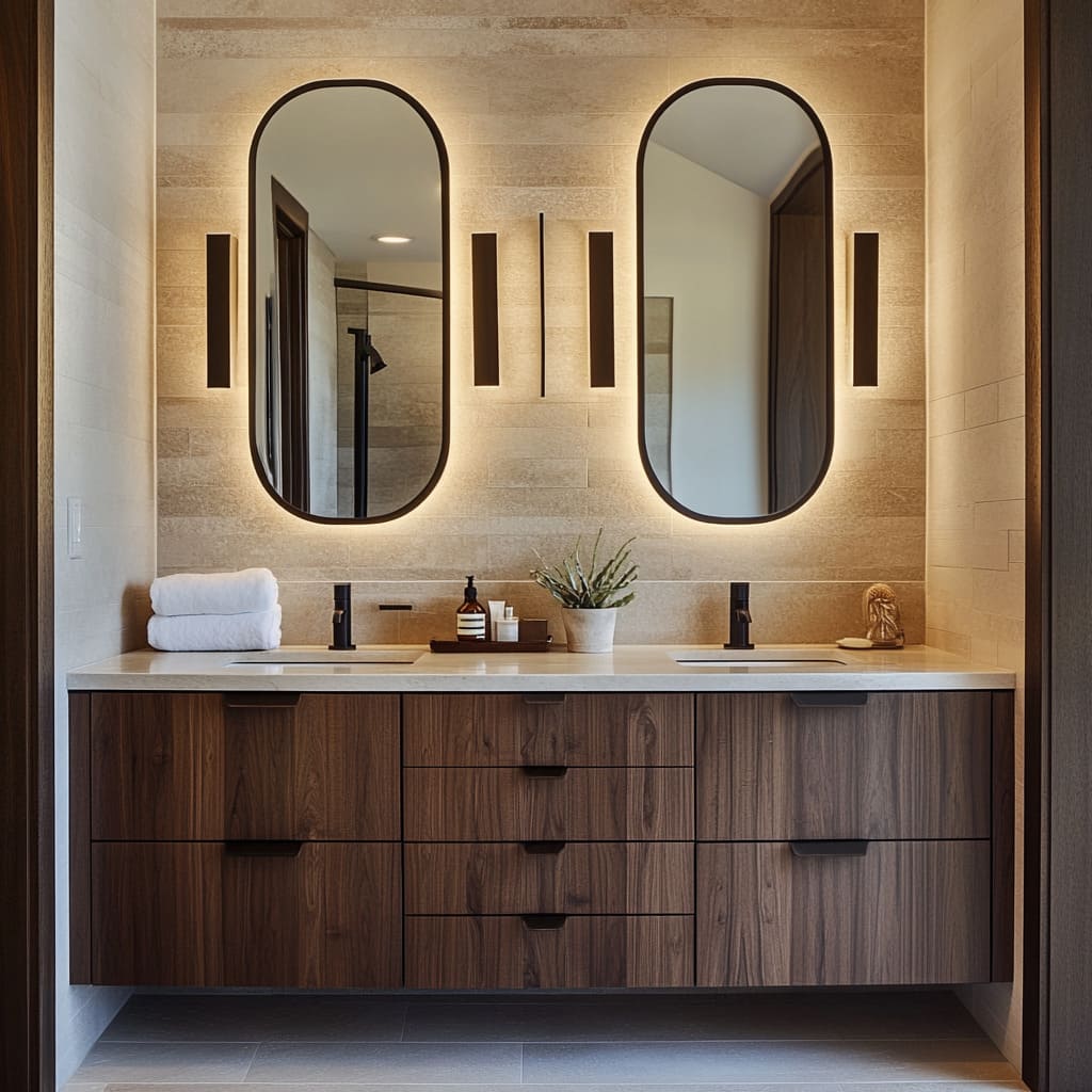 Such bathrooms can use curved shapes as a counterbalance to the vanity’s linear structure. Round mirrors, oval sconces, soft-edge counters, and curved basins bring a quiet gentleness to the layout.