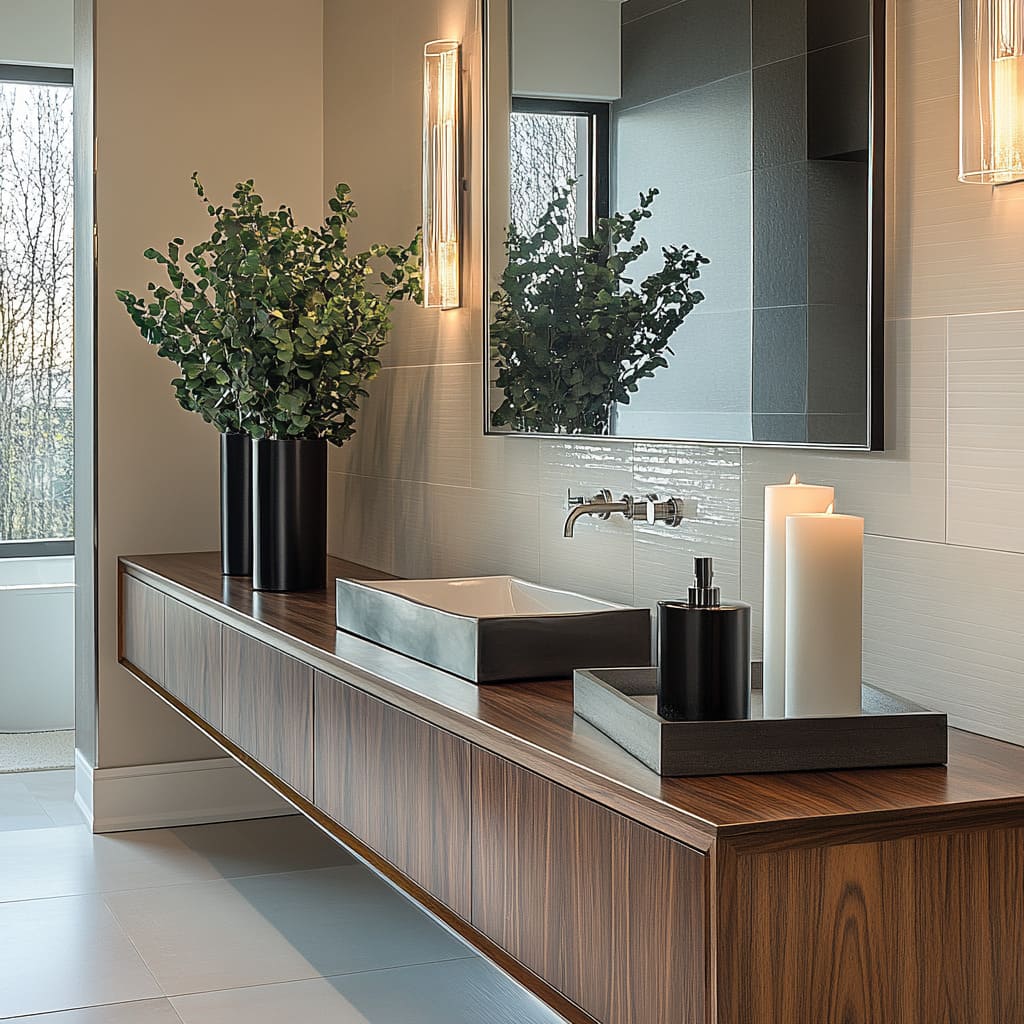 These strategies show how dark wood bathroom ideas gain sophistication through curated light rather than through strong color contrast. Light becomes the material that interacts with grain, texture, and form, shaping the overall mood of the space.