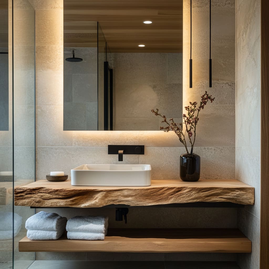 The vanity’s grain and shape determine whether the space feels calm, expressive, or sculptural.