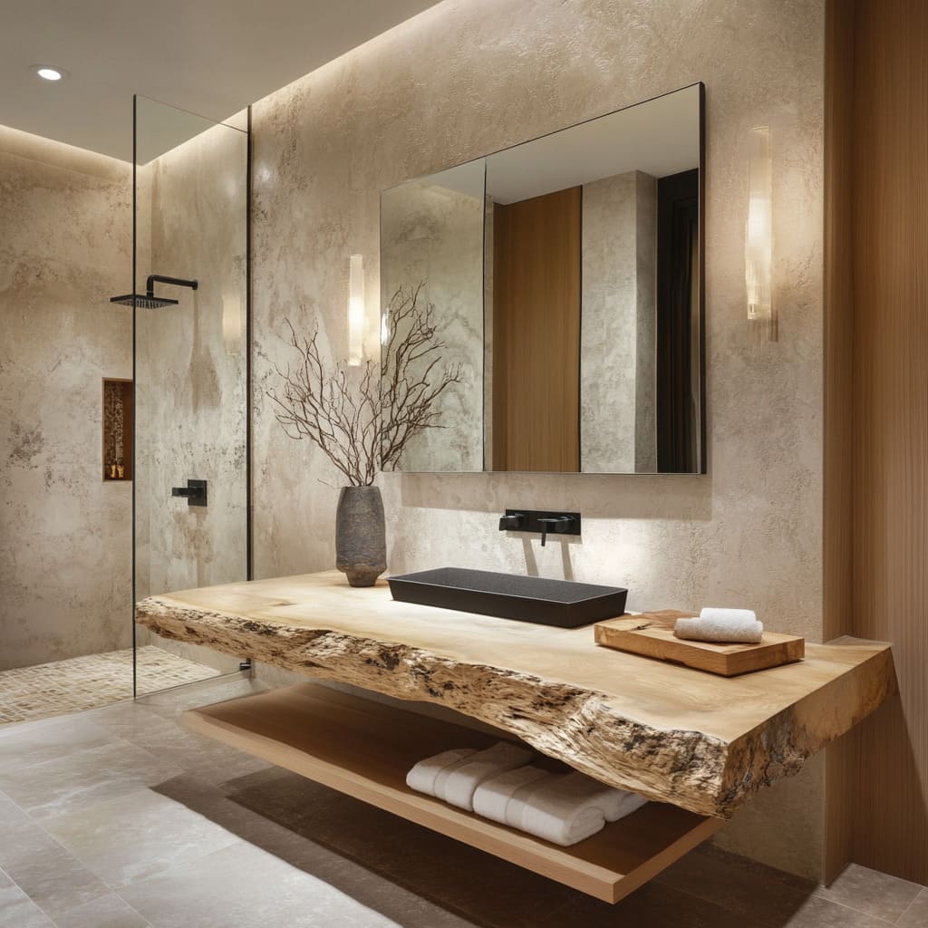 - Mottled Plaster + Live-Edge Wood – Supports natural irregularity with soft walls.