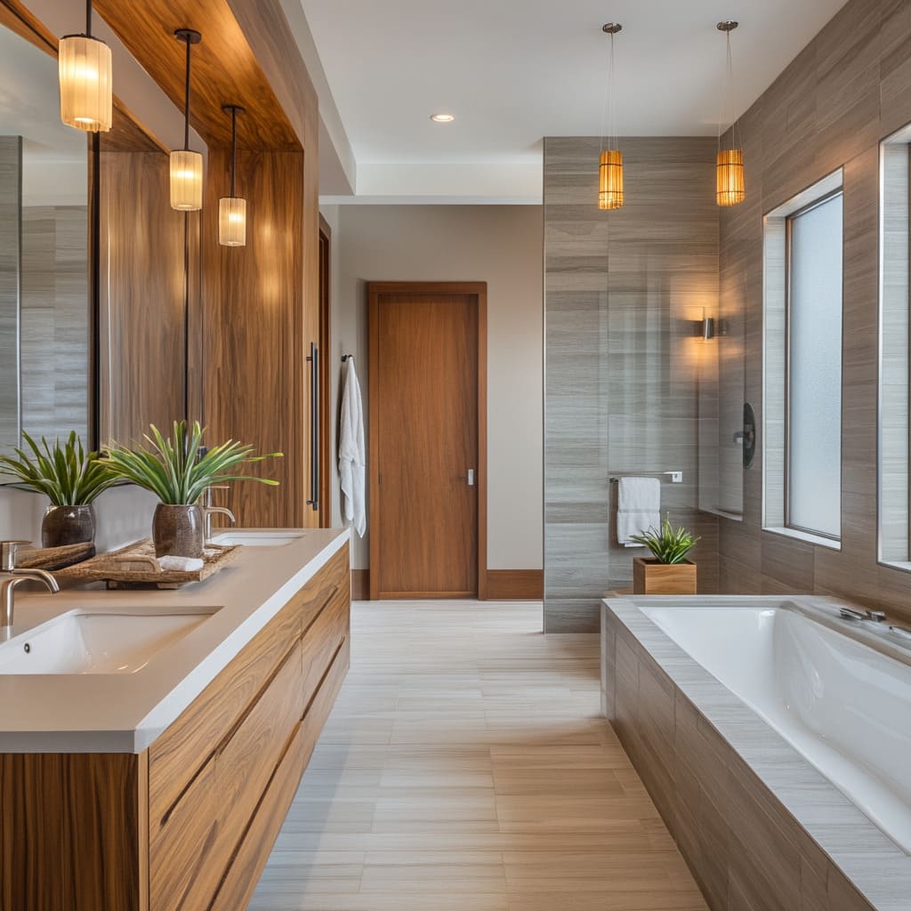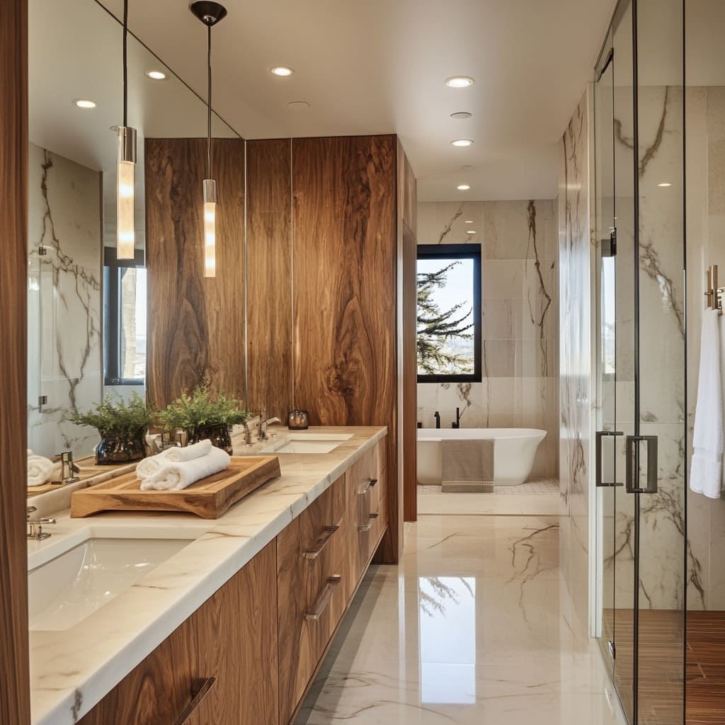 - Beige Stone + Mid Brown Wood – Creates spa-like warmth.