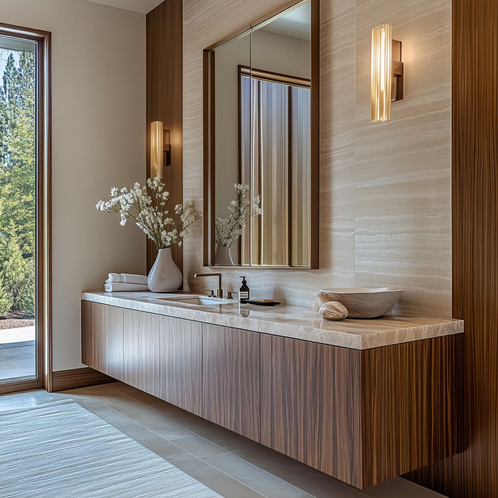In some spaces, the vanity becomes a refined slab that blends into a calm background; in others, it becomes the expressive element with bold texture and organic lines. Subtle details such as thin branches in a vase, a rounded basin, ribbed sconces, or a halo-lit mirror build layers of warmth without distracting from the primary visual story.