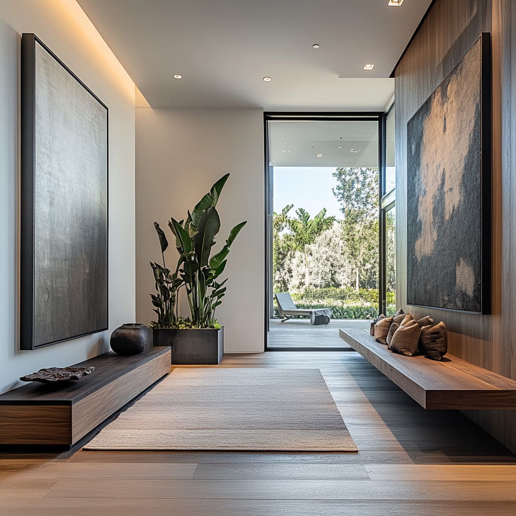 Serene gallery foyer design with glossy floor and two flanking plant guardians