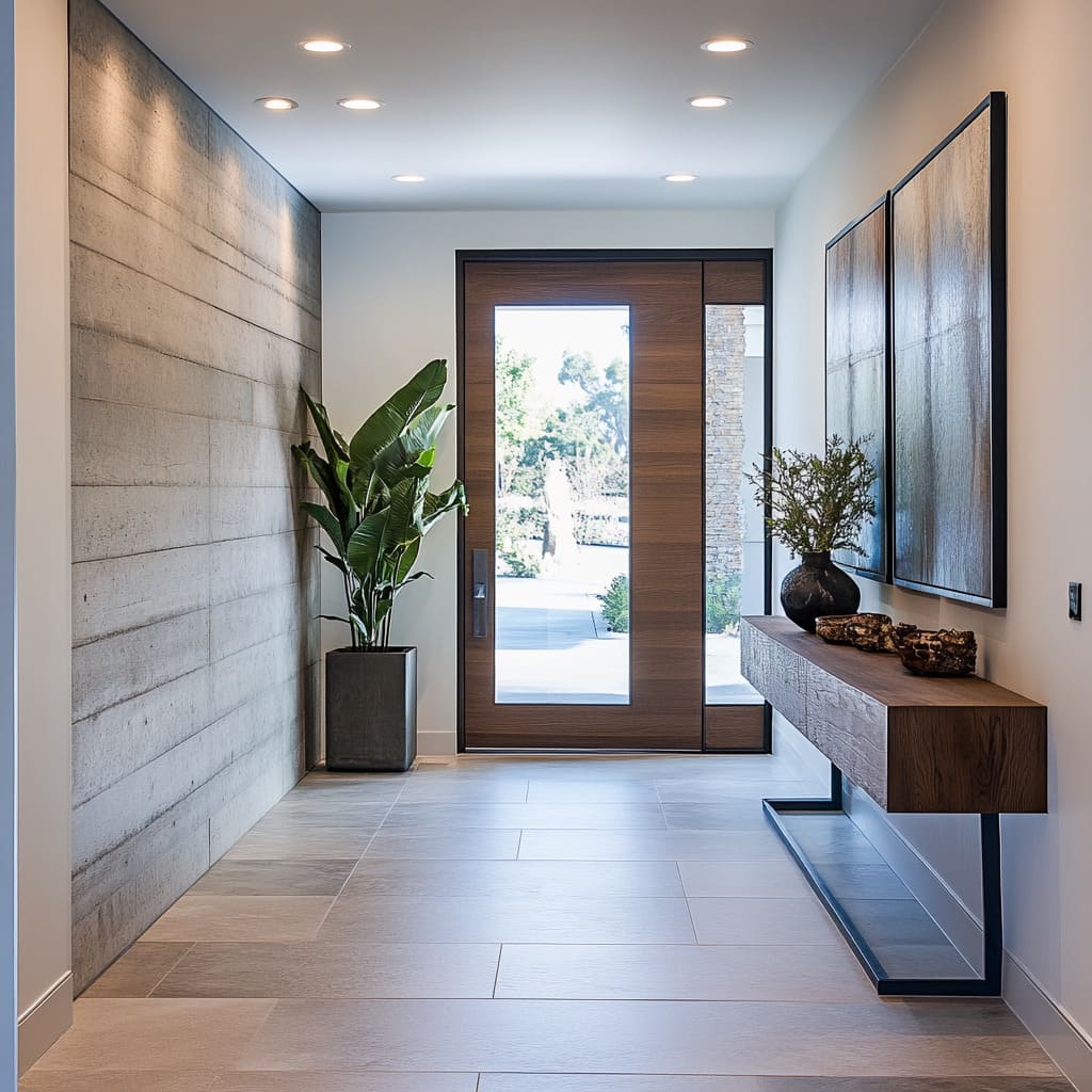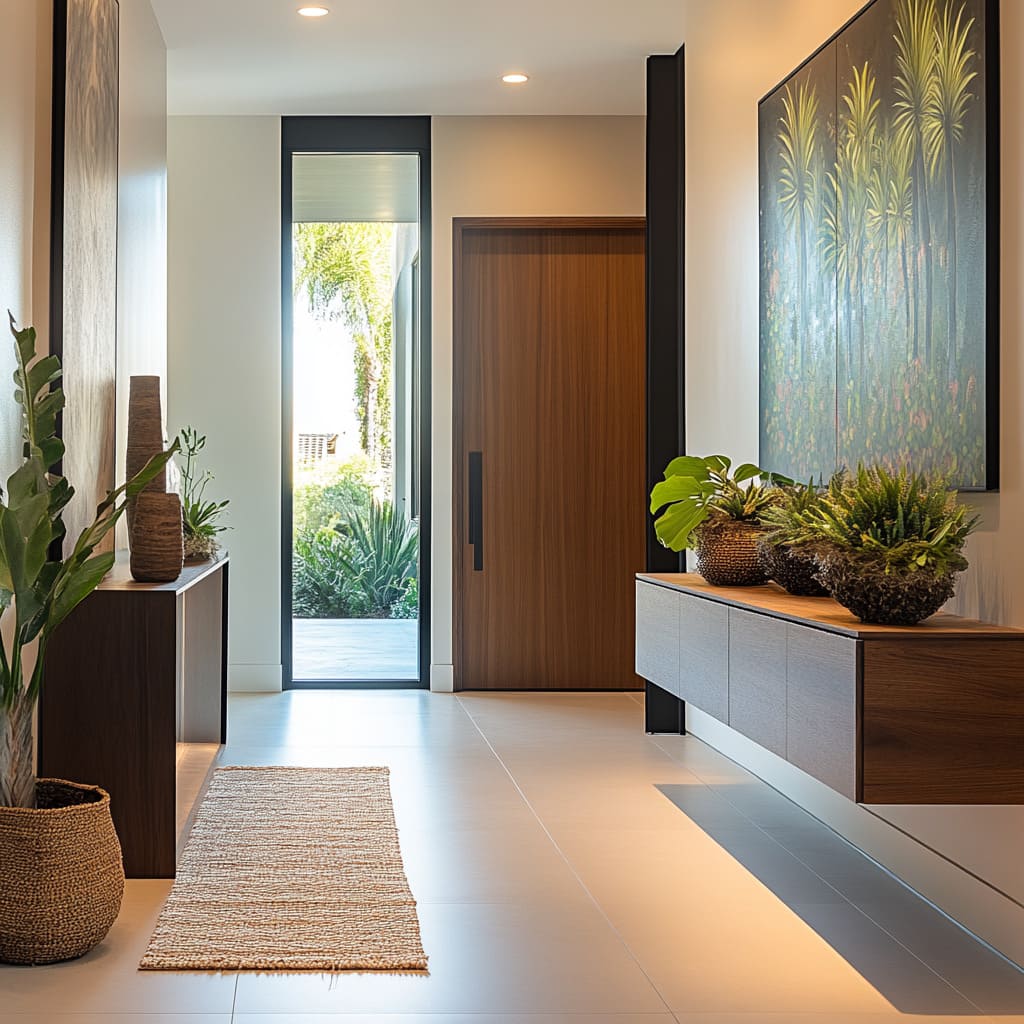 Many foyers use a balancing act where one side wall hosts the organic richness of plants and the opposite wall carries artwork, cabinetry, or textured finishes. This approach maintains harmony between two distinct moods: the lived-in softness of greenery and the refined calm of curated art.