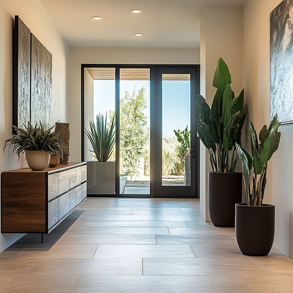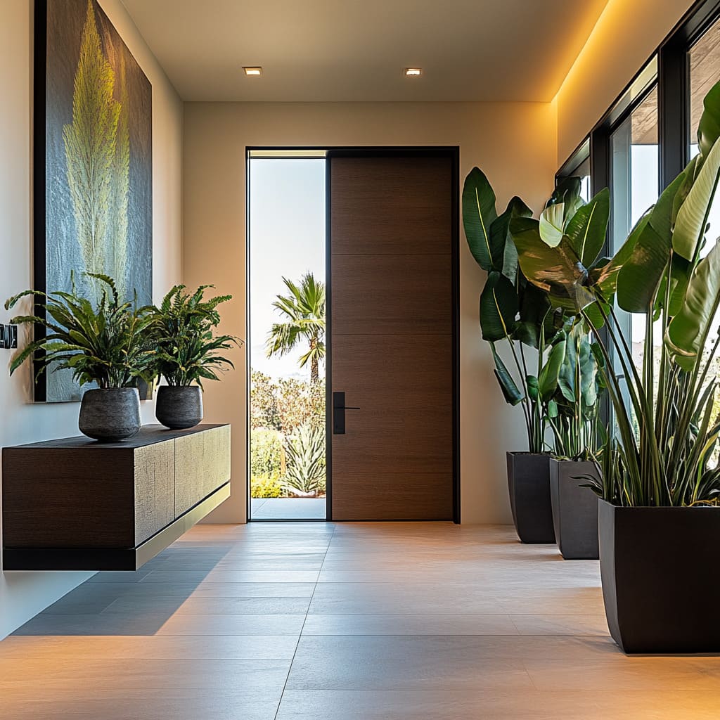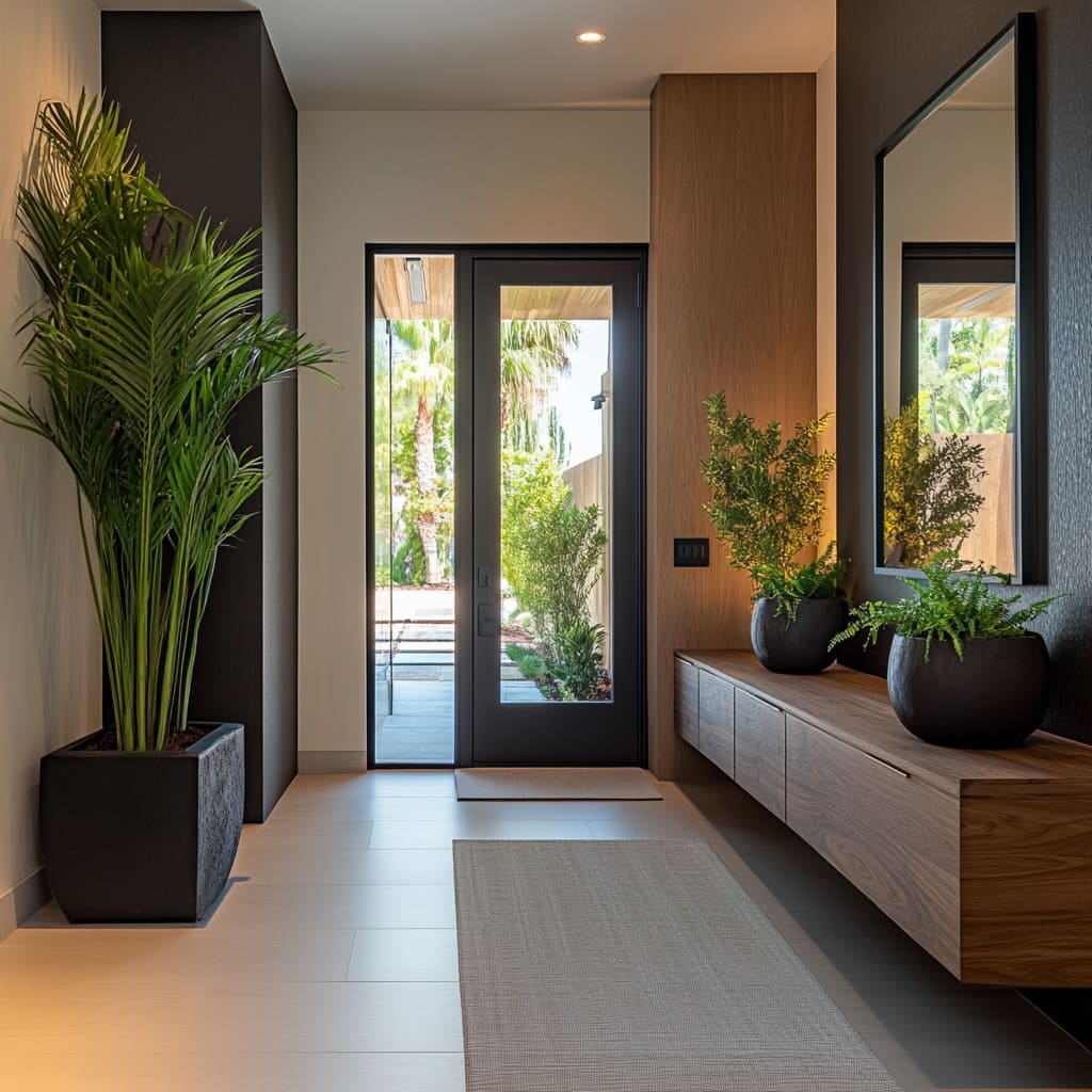 The simplicity of the palettes—warm neutrals, dark framing, green leaves—allows these plant forms to set the mood, making the foyer feel part of a larger natural scene. This format supports the broader identity of modern entrance foyer ideas, where interior and exterior blend seamlessly through controlled, layered greenery.