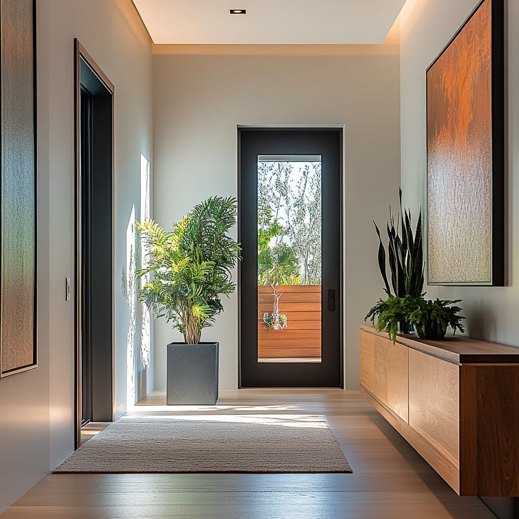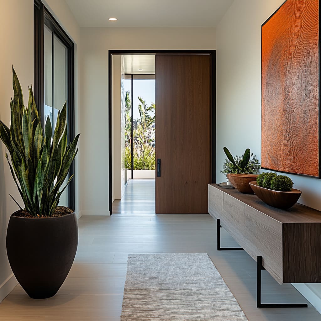 Creative Modern Entry Halls With Warm Wood, Plants, and Artful Styling