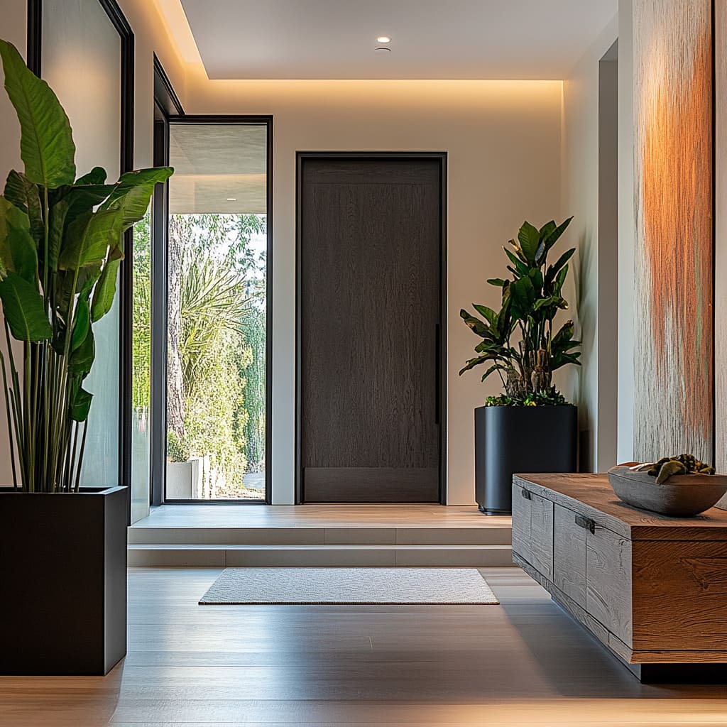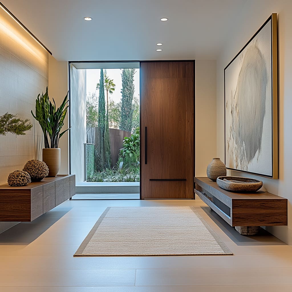 These pieces set the tone for modern entrance foyer ideas, where the door is both functional and artistic, often acting as the anchor around which the entire entry composition is arranged.