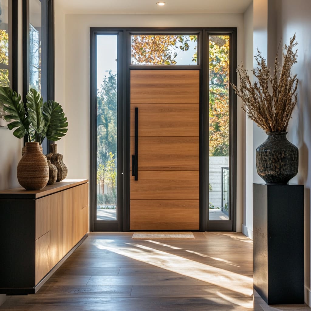 In many foyers, the main door is treated as a sculptural surface. Its grain, tone, and silhouette set the emotional weight of the entry, often working in quiet contrast to transparent panes of glass beside it.