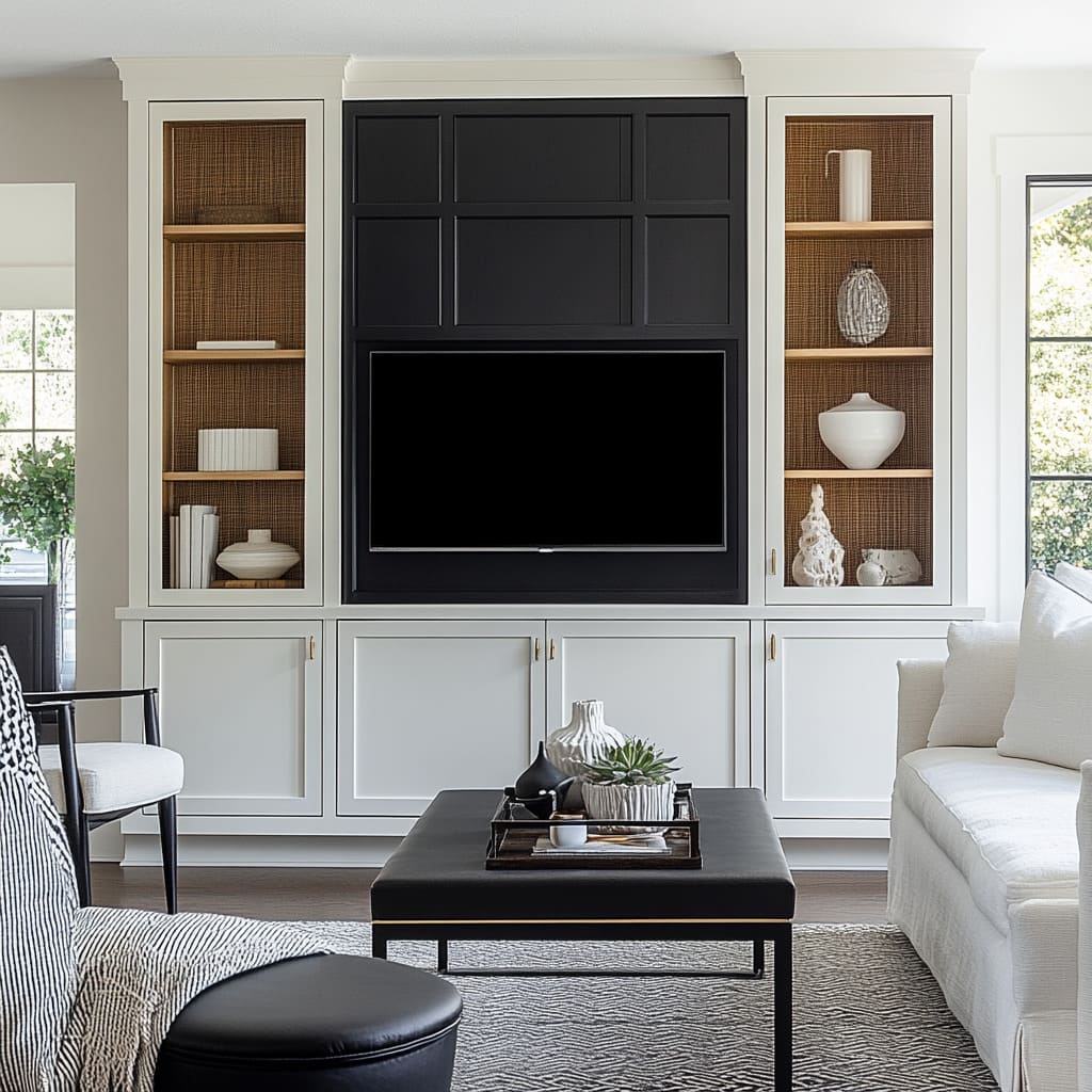 A black and white living room deisgn with a built-in wall unit featuring a black grid panel around the TV
