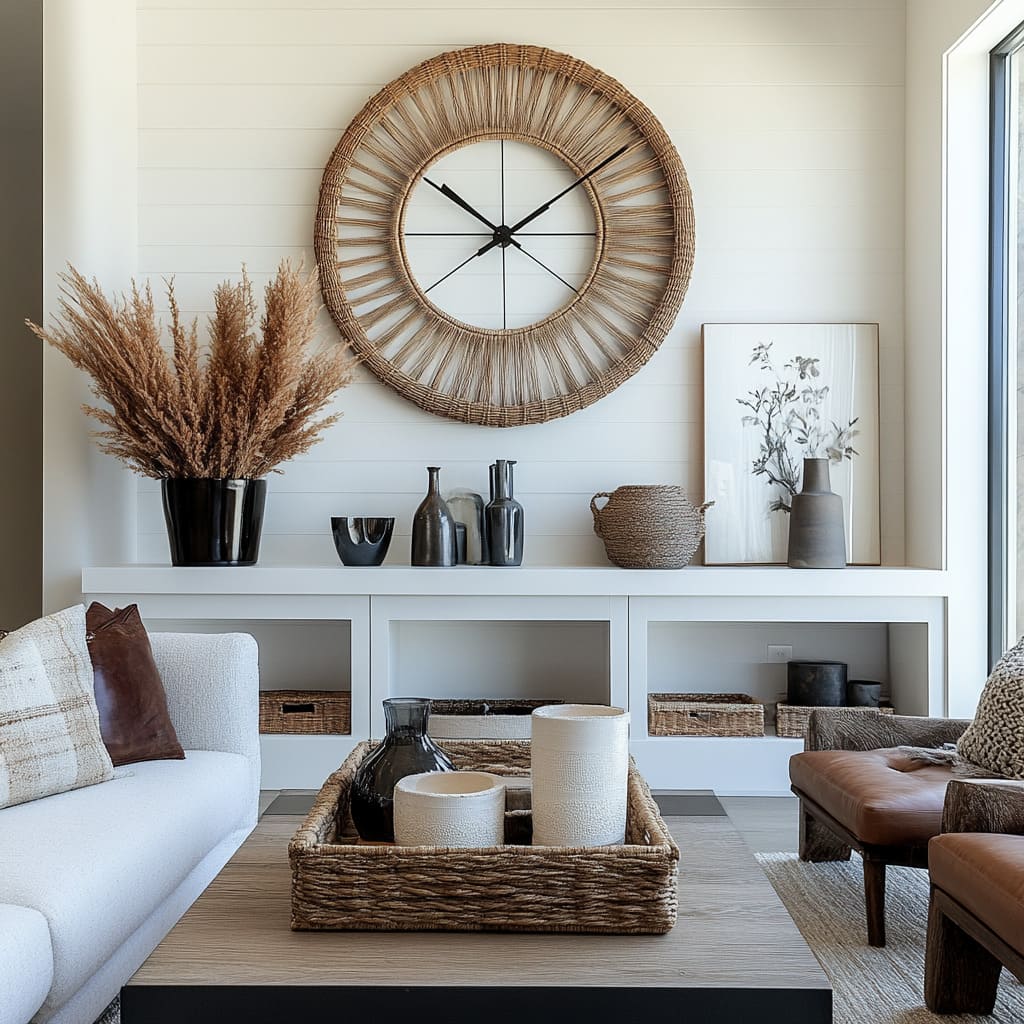 In the richest living room decor ideas in black and white, this warm note appears in woven baskets under consoles, pale wood shelves within dark niches, rattan clocks against white planking, soft caramel tonalities on leather seats, driftwood on trays, and stone fireplace surrounds in muted beige.