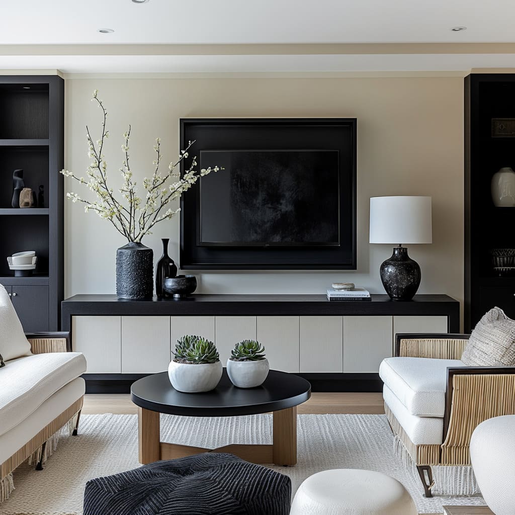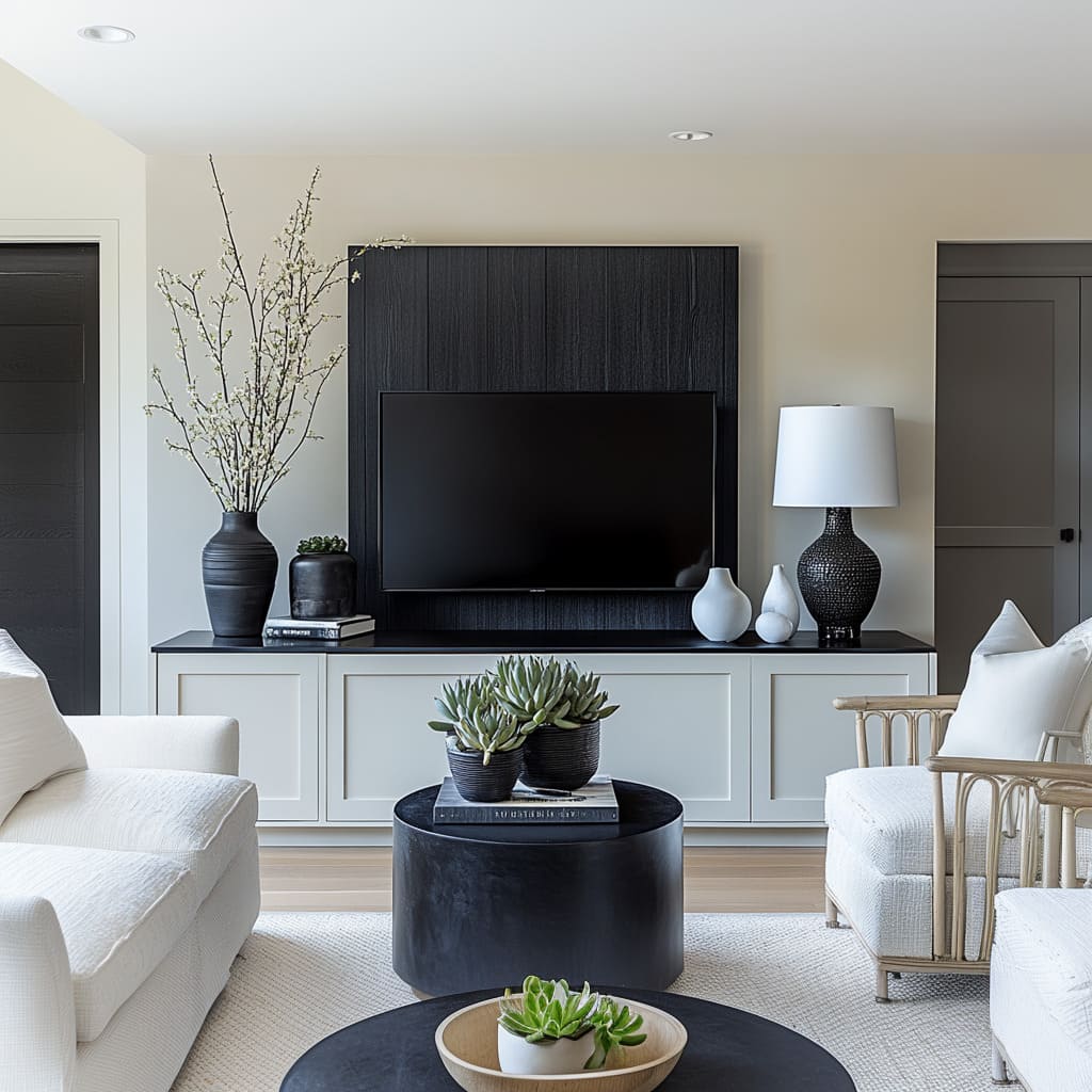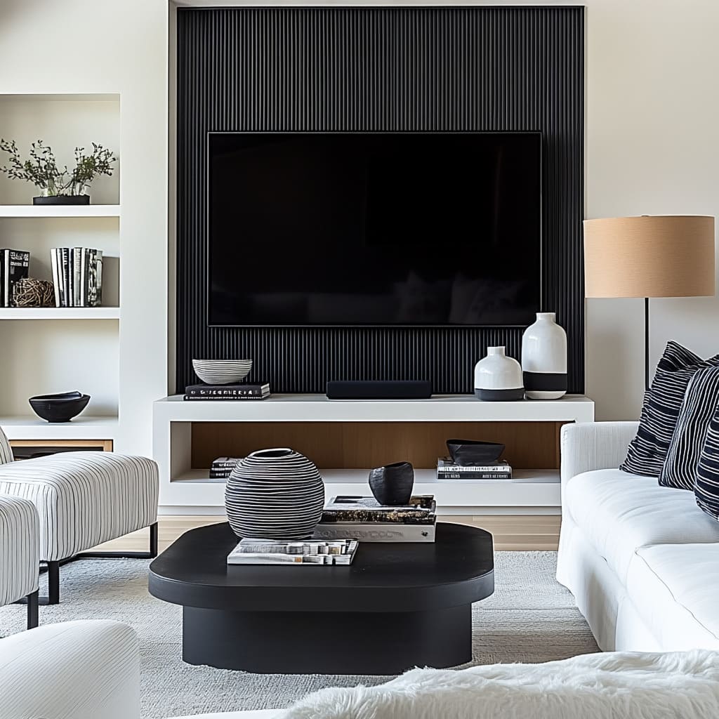 Many black white living room decorating ideas rely on linear systems—vertical panels, horizontal shiplap, gridded cabinet fronts, rectangular shadow boxes—because these shapes organize the scene around the TV wall. But whenever the linear structure becomes strong, the room introduces a curved counterpoint: a round coffee table softens a tall panel wall; a split black-and-white disk becomes a sculptural focal point against fine vertical grooves; a large arched niche creates a soft “bowl” for the TV; a ribbed round vase adds a cloud-like form beneath a geometric cabinet.