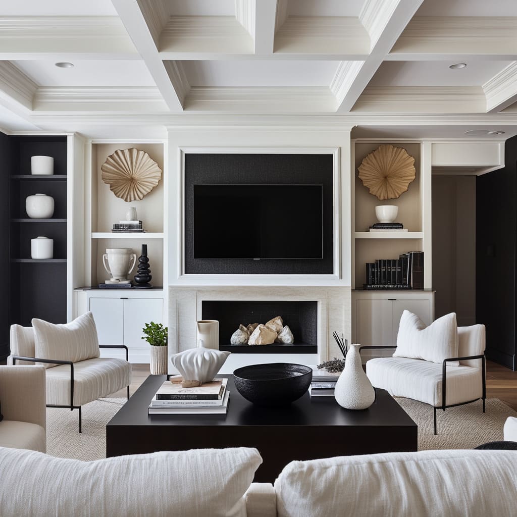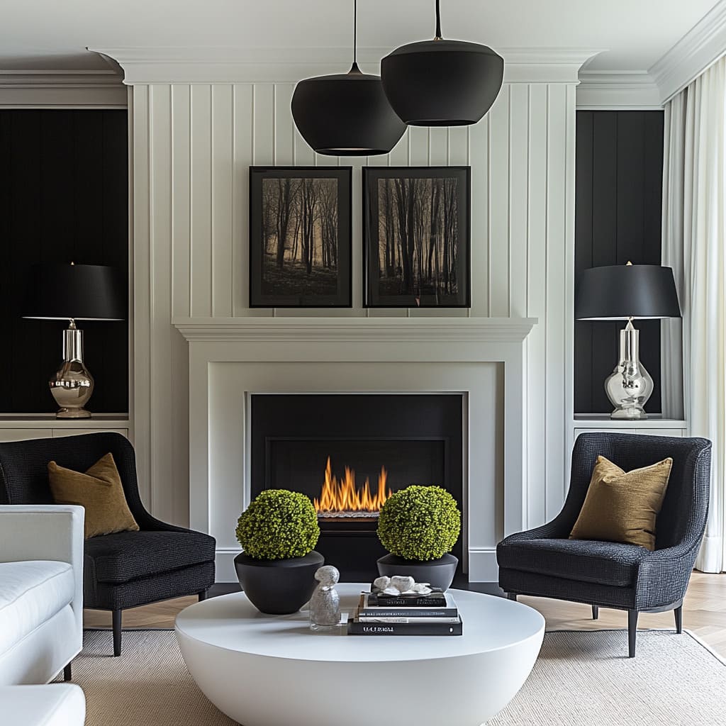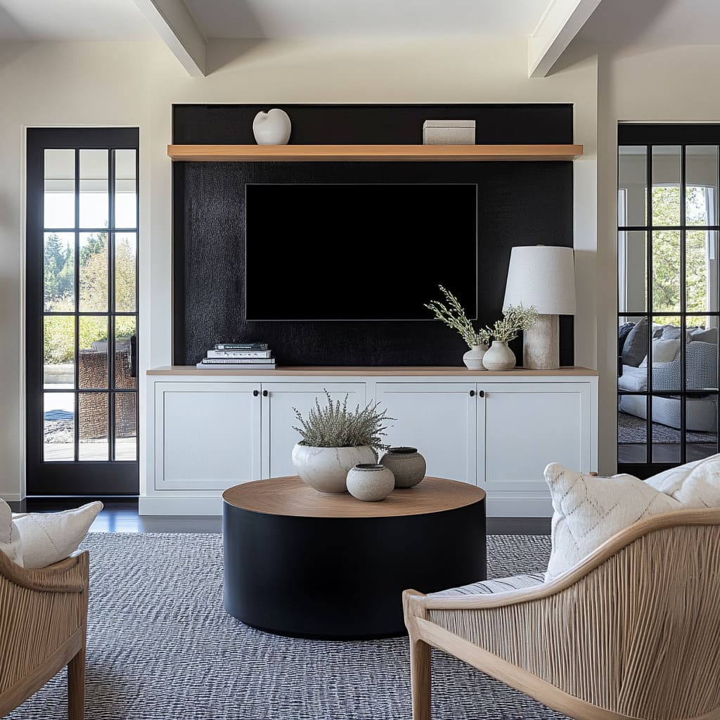 Many black white living room decorating ideas rely on linear systems—vertical panels, horizontal shiplap, gridded cabinet fronts, rectangular shadow boxes—because these shapes organize the scene around the TV wall. But whenever the linear structure becomes strong, the room introduces a curved counterpoint: a round coffee table softens a tall panel wall; a split black-and-white disk becomes a sculptural focal point against fine vertical grooves; a large arched niche creates a soft “bowl” for the TV; a ribbed round vase adds a cloud-like form beneath a geometric cabinet.