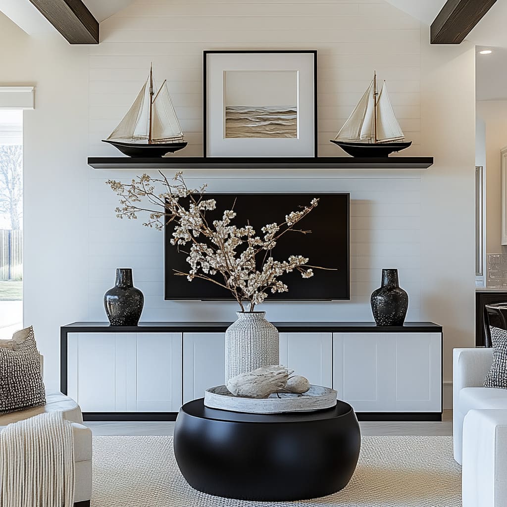 A crisp black and white living room styling ideas with horizontal white boards, a long black floating shelf holding sailboat models