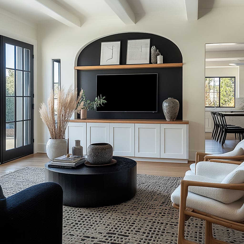 A sculptural black and white living room design featuring a large arched black niche with a TV, a warm wood shelf with line-sketch art