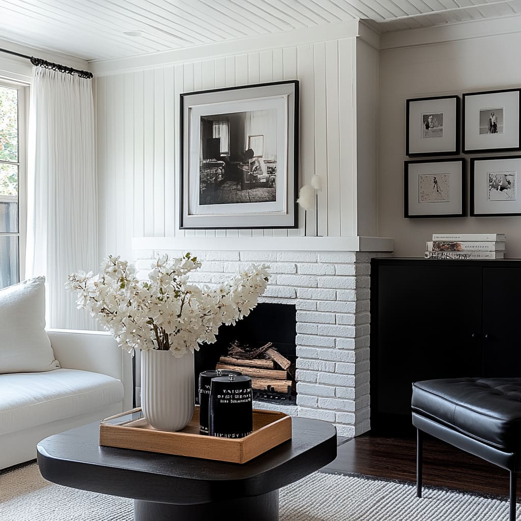 A soft monochrome living room decorating concept with white vertical paneling, a matte white brick fireplace, black firebox, framed artwork