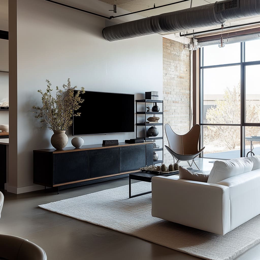 An industrial black and white living room ideas featuring exposed ductwork, a textured black TV console framed in warm wood