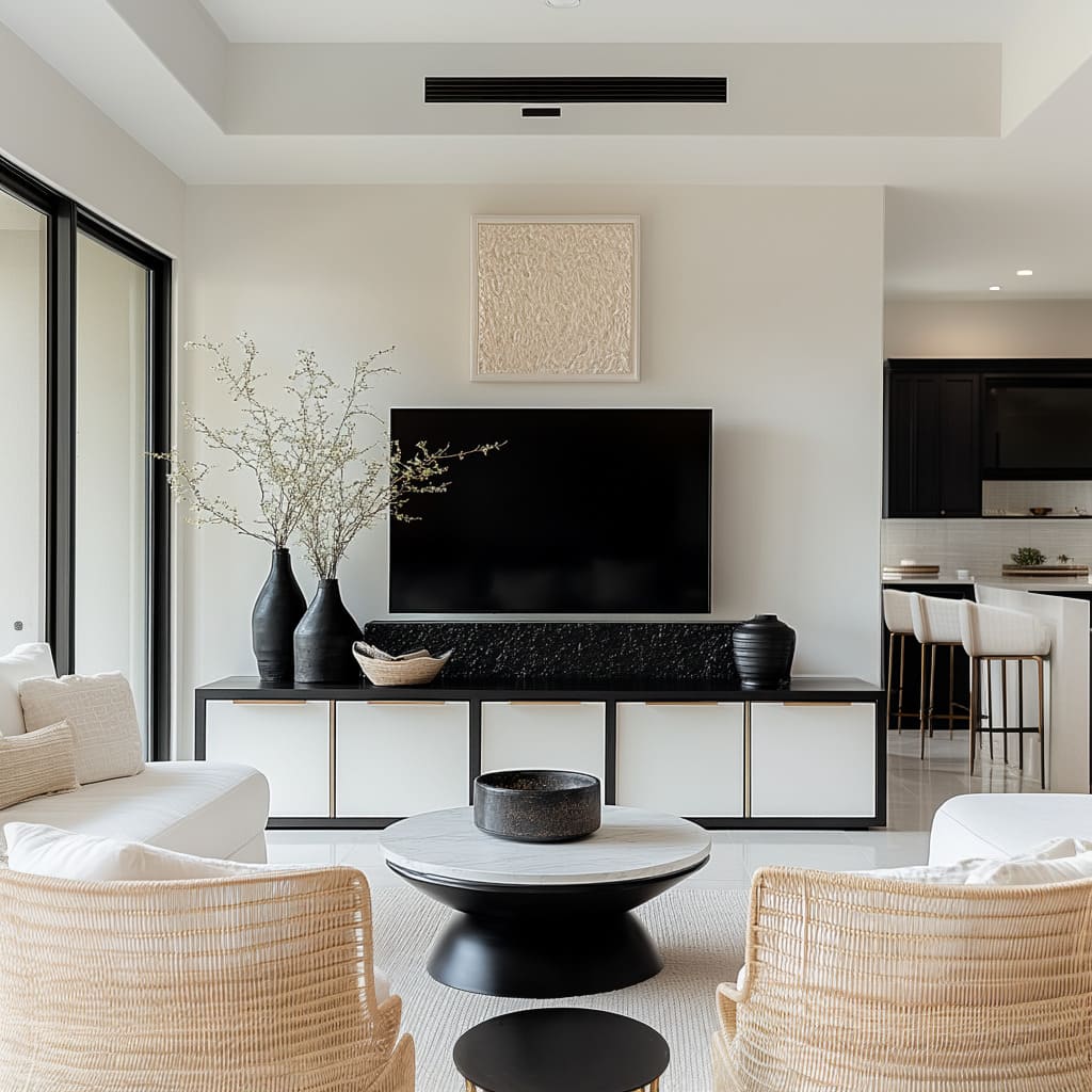 This breathing room is one of the most defining qualities of refined black and white living room decorating ideas—the palette is strong, but the atmosphere remains quiet because nothing is crowded.