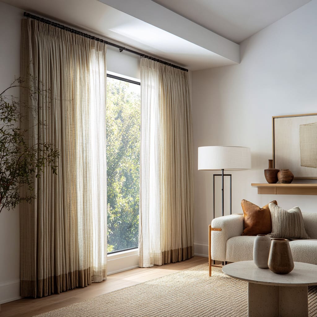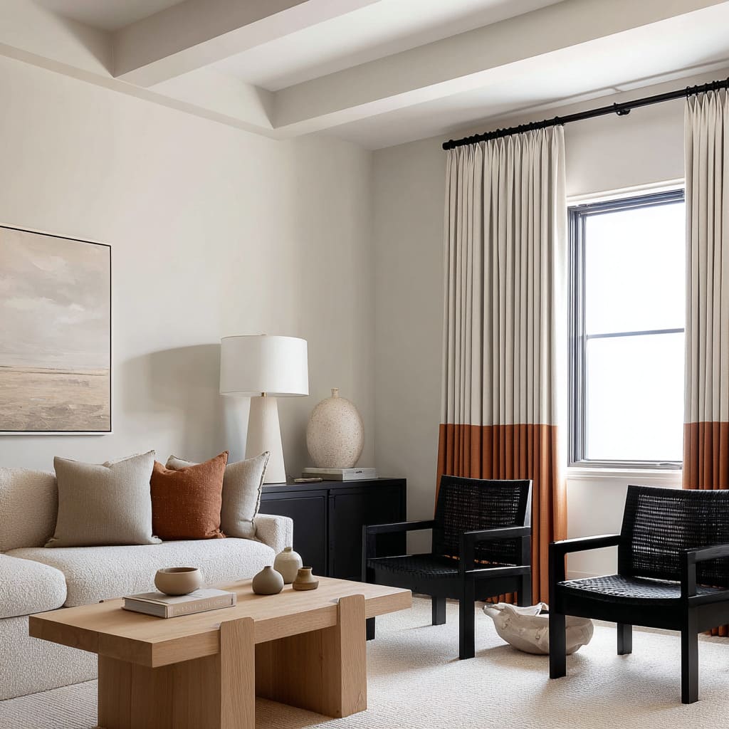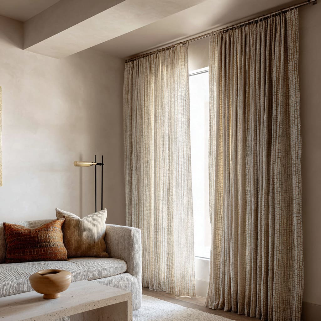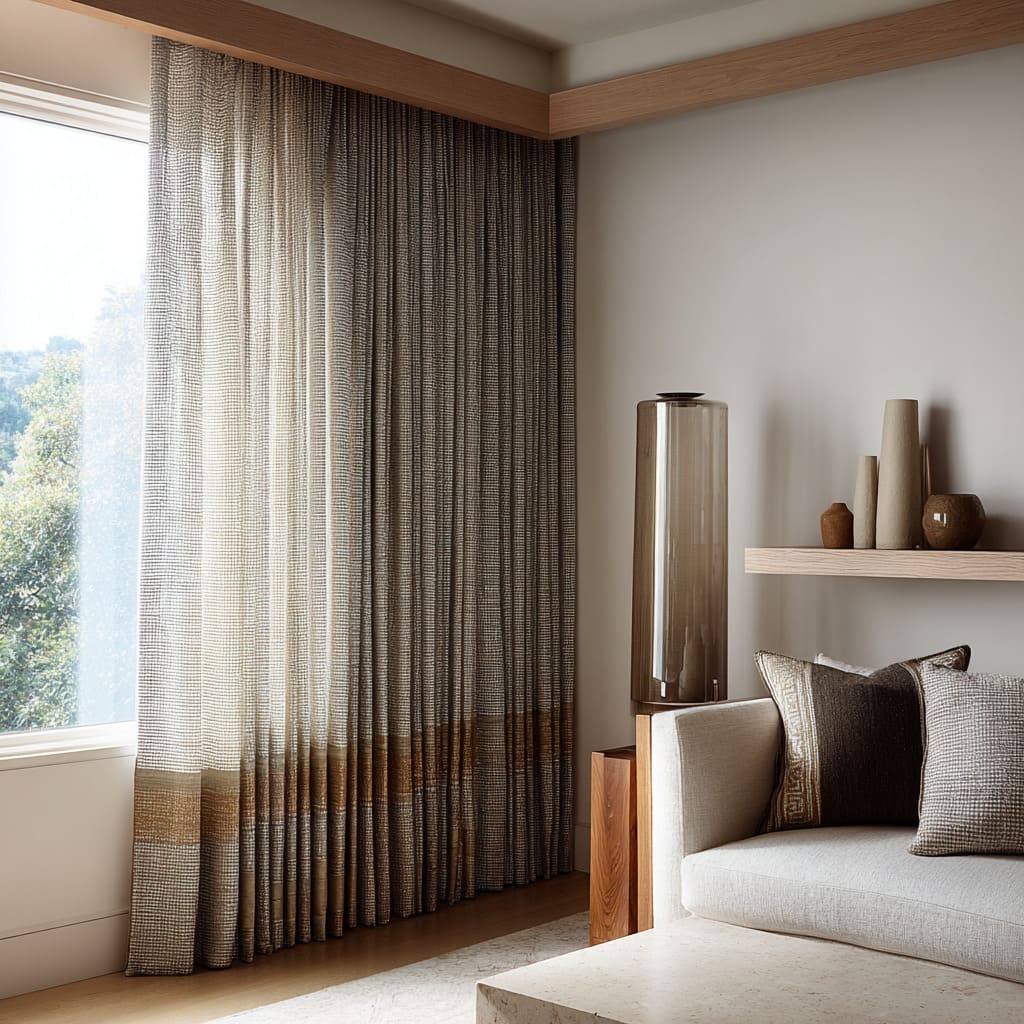 Three-tone arrangements appear as fabric “paintings,” where light, mid, and warm tones stack as vertical color fields. This use of depth allows to build beautiful living room drapes that behave more like sculptural compositions than window treatments.