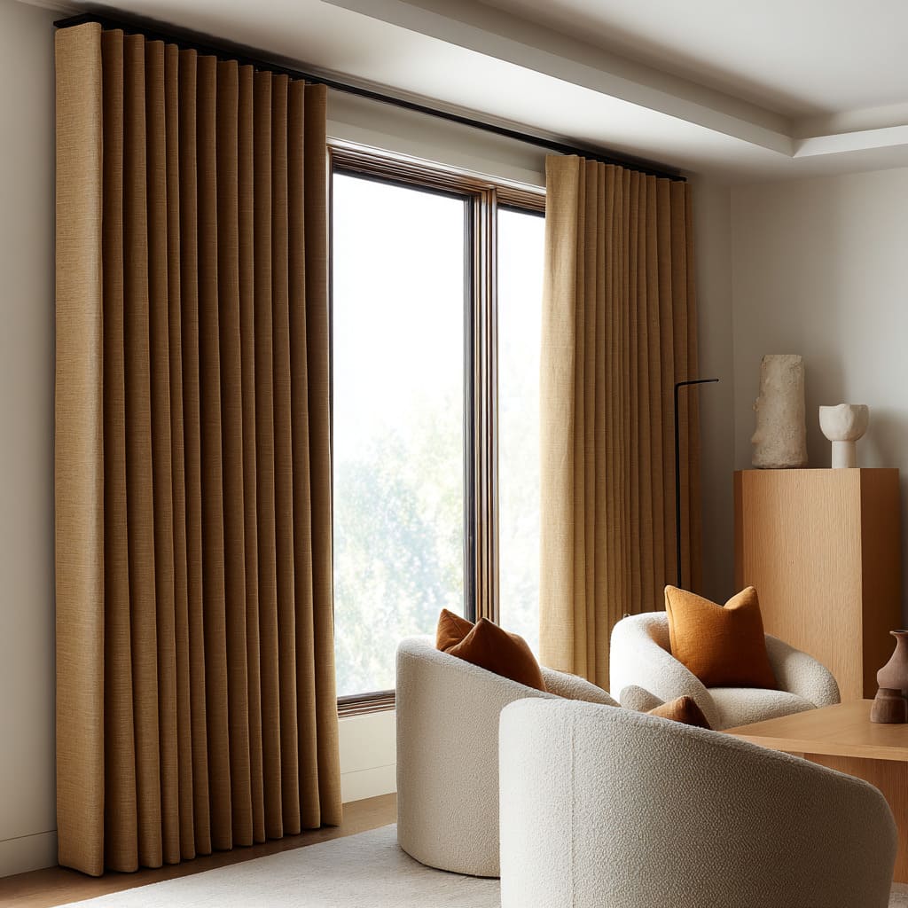 The spacing and character of folds influence the personality of the room more than most people realize. Some interiors lean on tight, disciplined pleats that resemble fluted millwork, giving the curtain wall a column-like precision.