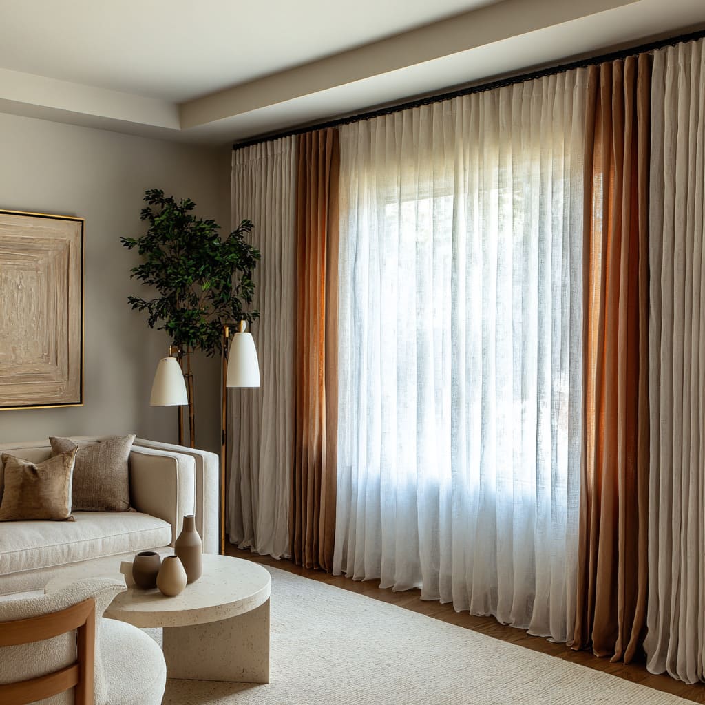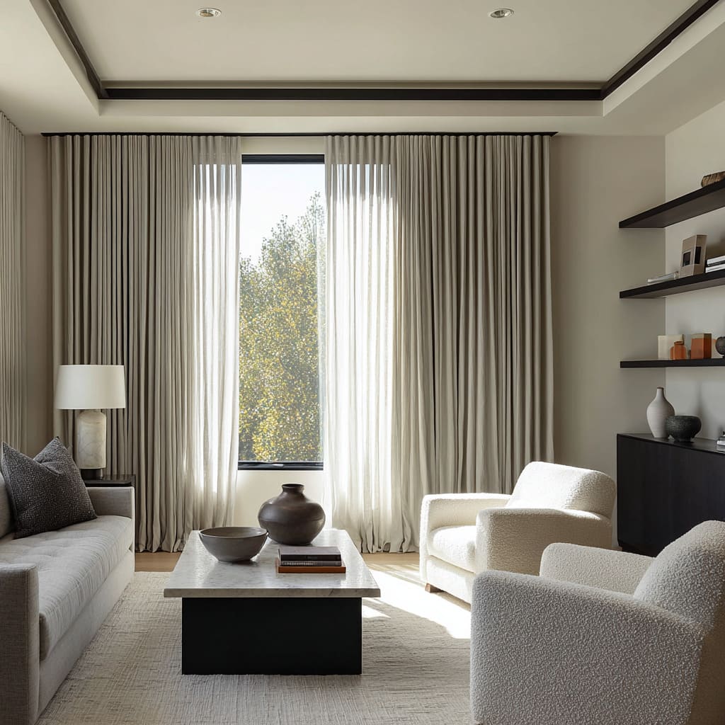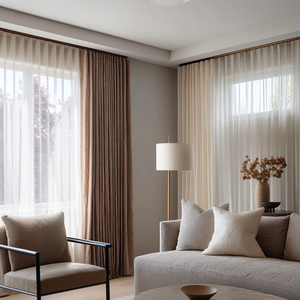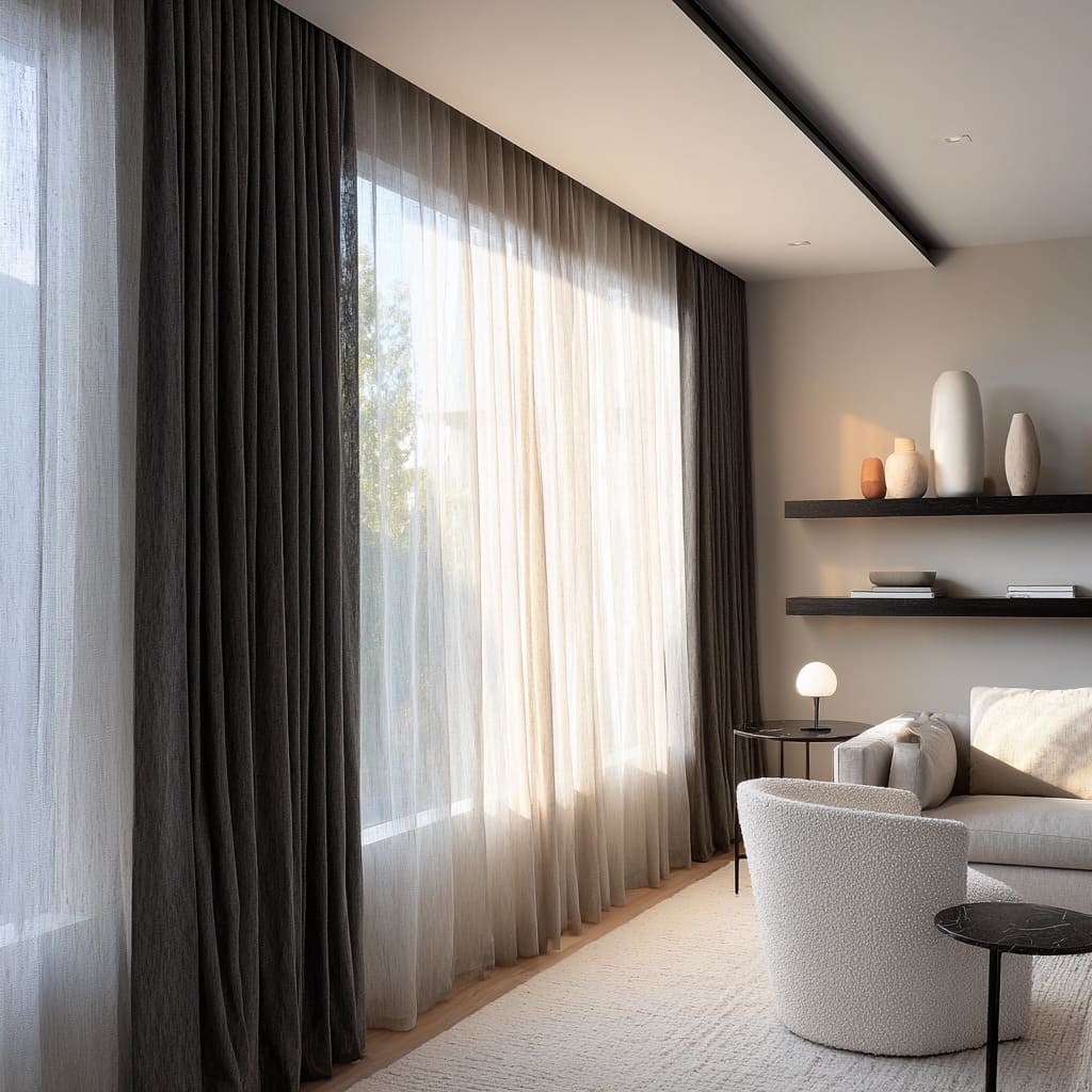 Layered curtains add depth not just by doubling fabrics, but by creating variations in light intensity and color temperature. Sheers often form the glowing “core” of a window wall, while heavier panels shape the edges like soft frames.