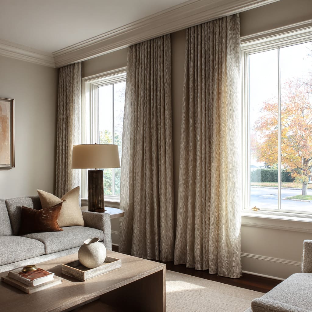 Across many drapery ideas for living room windows, the rhythm of the pleat becomes its own decorative element. Even without pattern or color variation, the play of light across the vertical surfaces produces visual depth.