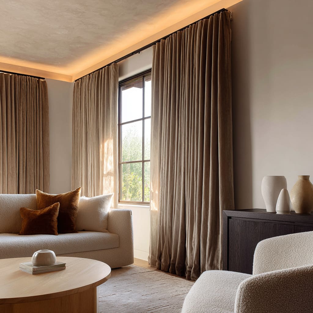 Light-filled sheers generate a breezy, open atmosphere, suitable for daytime lounging or bright social spaces. Velvet or subtly lustrous fabrics lend a sense of stillness and low, late-afternoon richness.