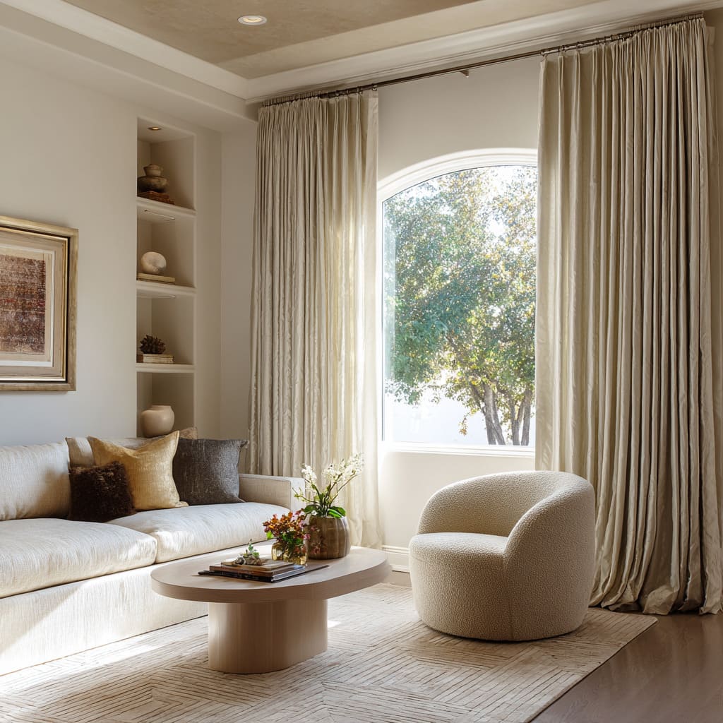 Art pieces mirror tonal gradients, ceramics echo drapery textures, and occasional tables adopt shapes that complement the curtain’s rhythm—round forms placed before strict pleats or rectilinear pieces used to stabilize softer folds.