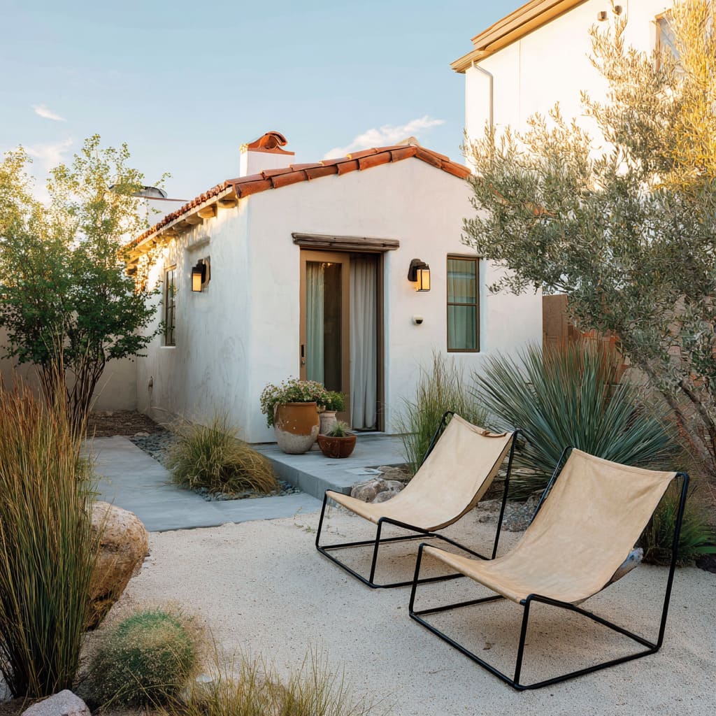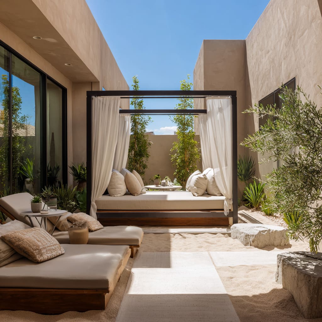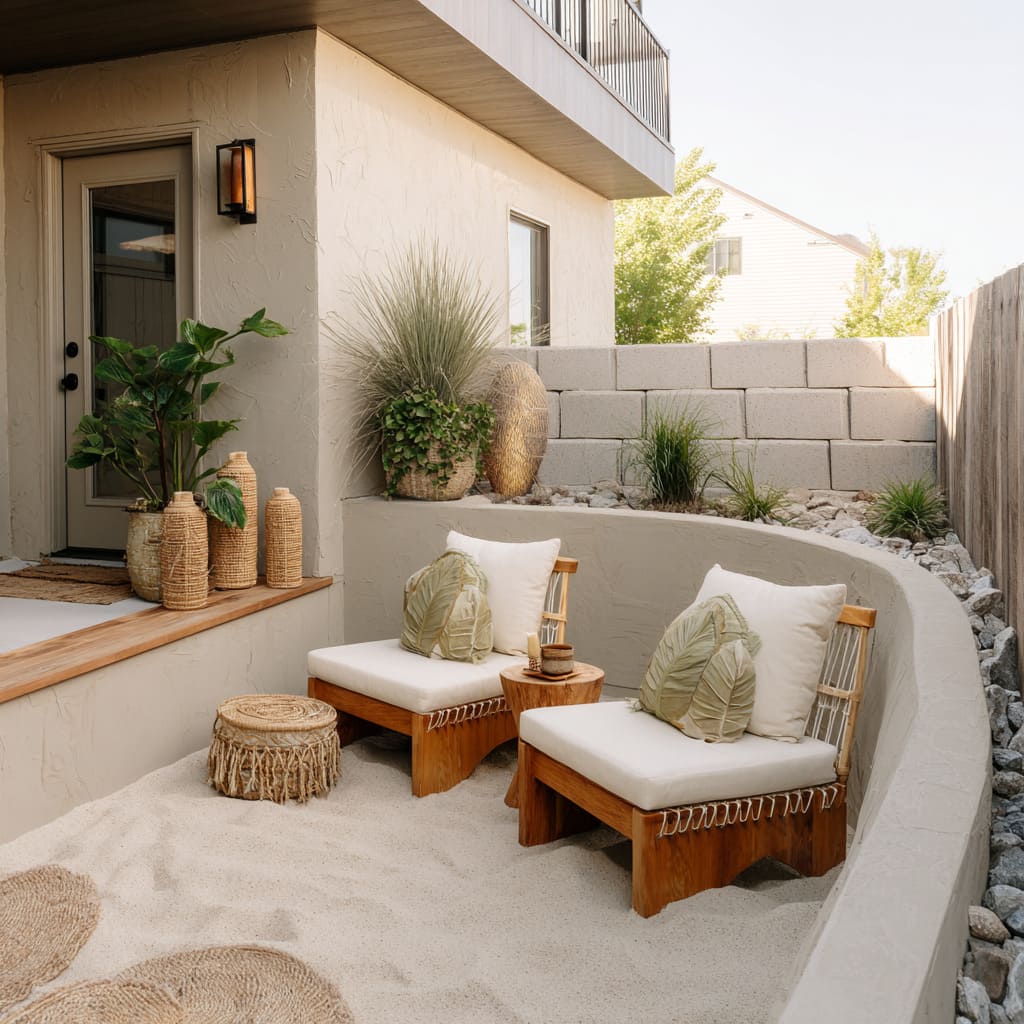 A small corner by a retaining wall transforms into a sun pocket furnished with a pair of deep lounge chairs. A tiny courtyard gains a resort-like identity when the ground plane shifts from hard paving to soft sand.