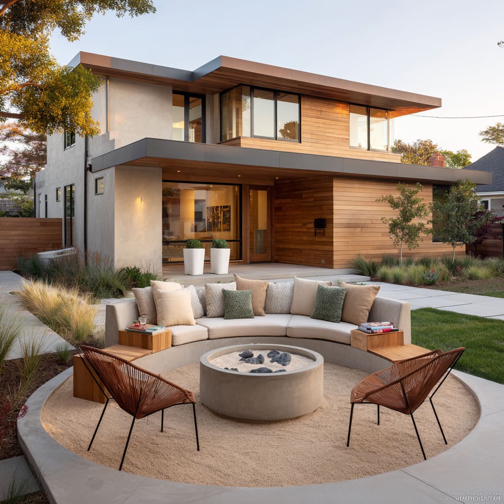 - Curved built-in benches hugging a round pit to maximize seating without crowding furniture.