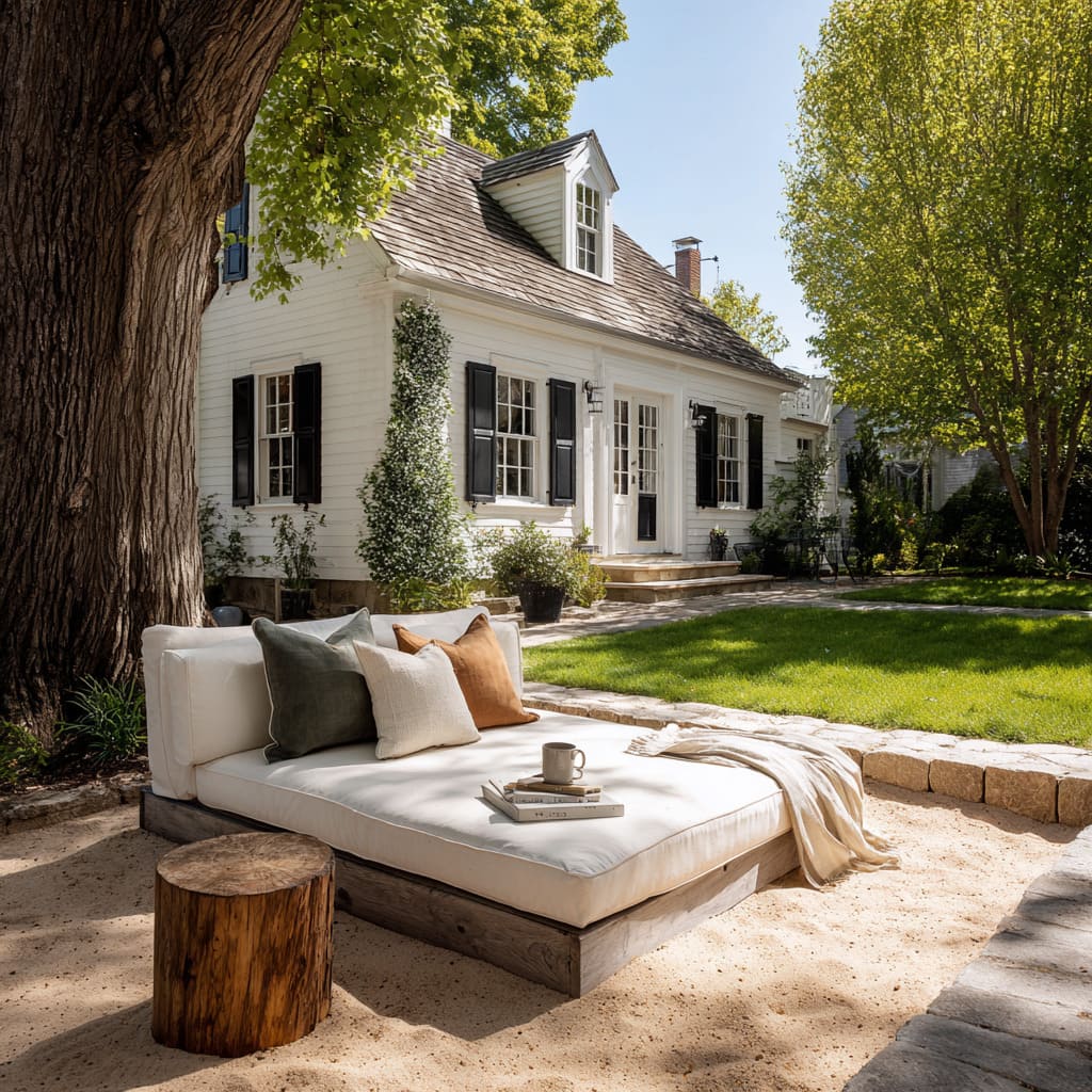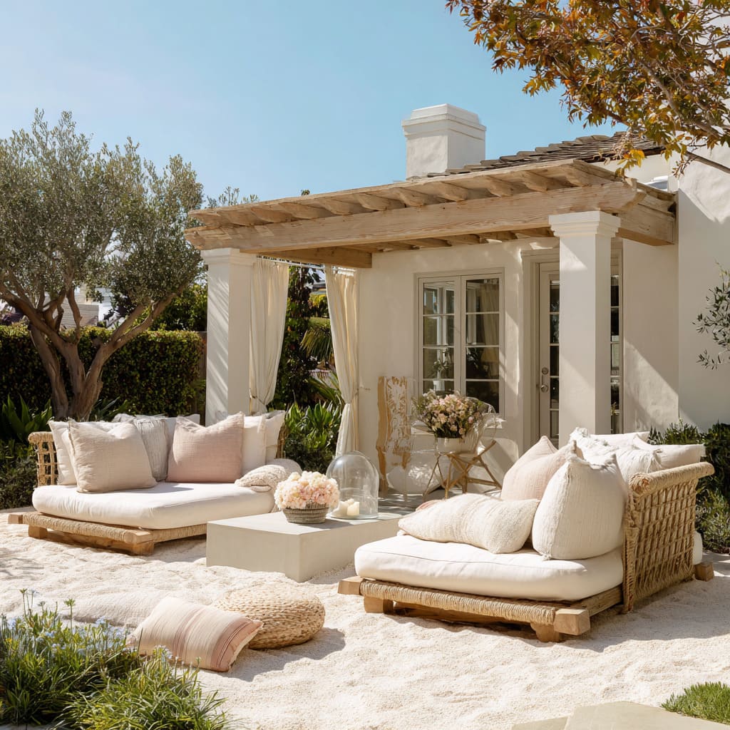 When sand is used as the main ground material, the entire seating strategy changes. Low, broad pieces work best: daybeds, deep outdoor sofas, and relaxed lounge chairs with soft cushions.