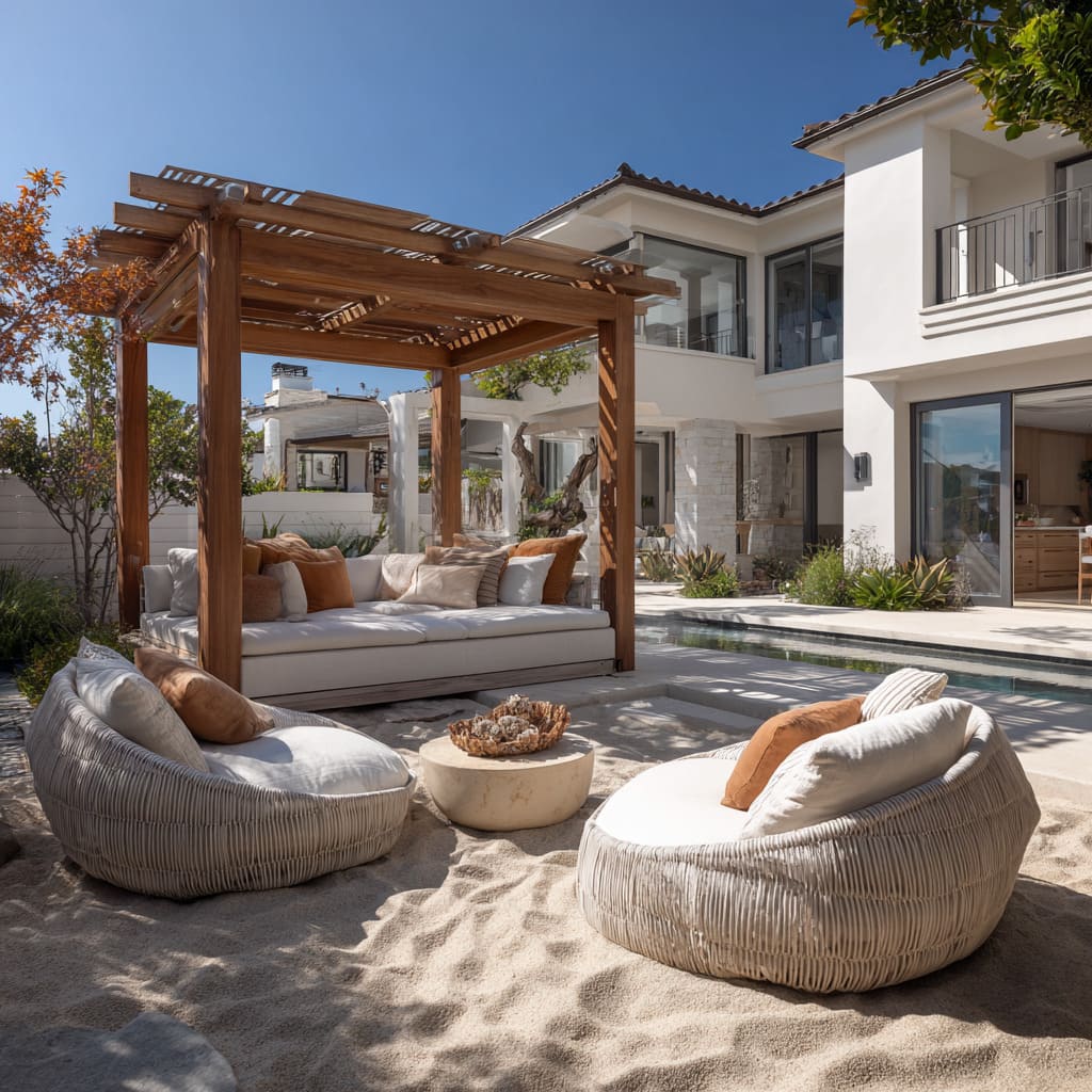 This balance becomes a defining tone for many backyard ideas with sand: clean structure above, soft texture below. Whether the surrounding elements are timber beams, metal pergolas, or stucco walls, the interplay of geometry ensures that the sand feature feels intentional and visually anchored.