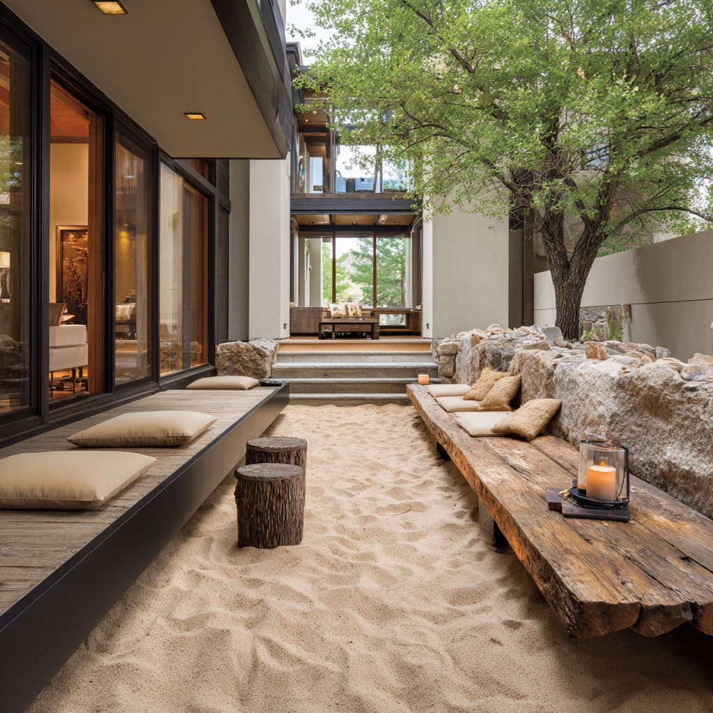 In a house with warm timber and wide porches, a sunken circular pit on golden sand enhances the sense of comfort and hearth. Homes with sharp, modern silhouettes benefit from sand carved into geometric patios flush with concrete, emphasizing clean lines while adding gentle texture.