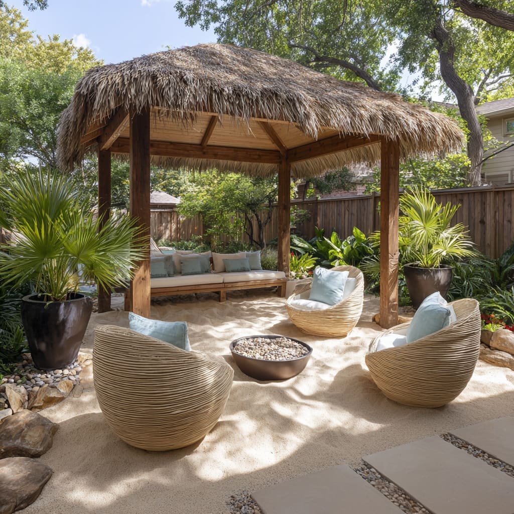 Timber frames, wicker structures, and rope accents create gentle echoes of natural surroundings such as trees, fences, and pergola beams. This arrangement supports the broader goal: turning the sand area in backyard layouts into comfortable, balanced outdoor rooms.