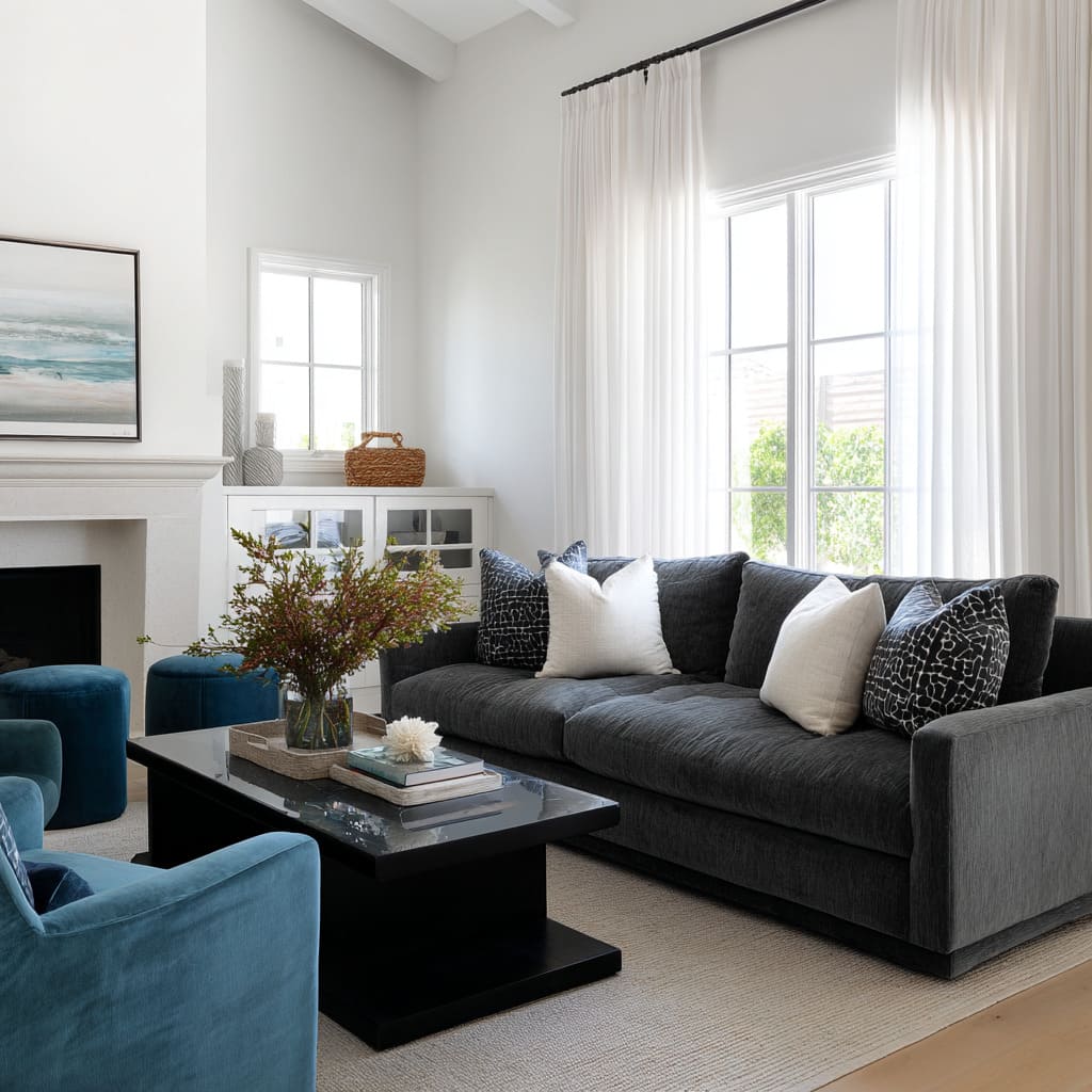 Deep charcoal seating can be the strongest visual mass in a bright room if it is handled as a soft shadow instead of a hard block. The most convincing versions rely on: