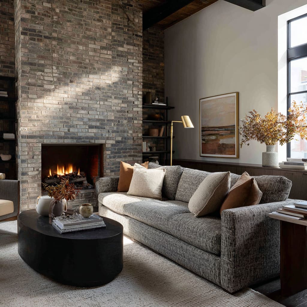 Concept with Loft-inspired brick fireplace and warm-gray textured sofa