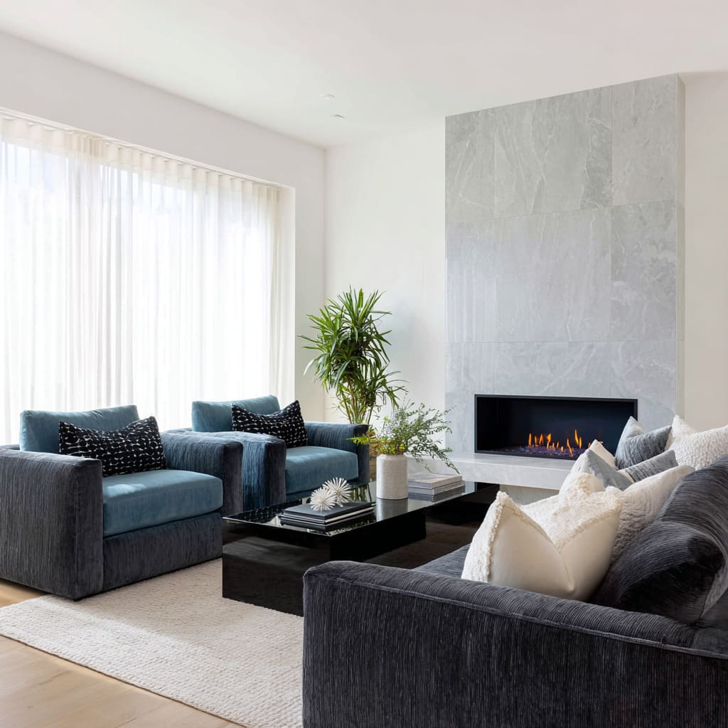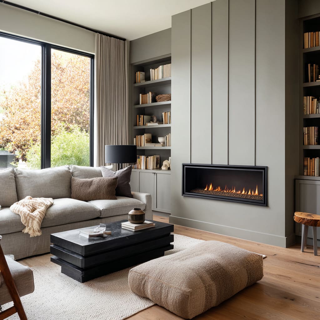 Designs can build calm through horizontal banding: a long linear fireplace reads like a horizon line, the sofa becomes the central middle band, and a dark low table acts as the base band. Striped grey upholstery strengthens this organizing principle because it echoes the room’s main geometry while staying soft through weave blur.