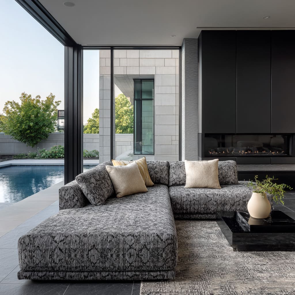 Modern glass-wall living room concept with a patterned grey sectional as the bridge between pool-blue and matte black
