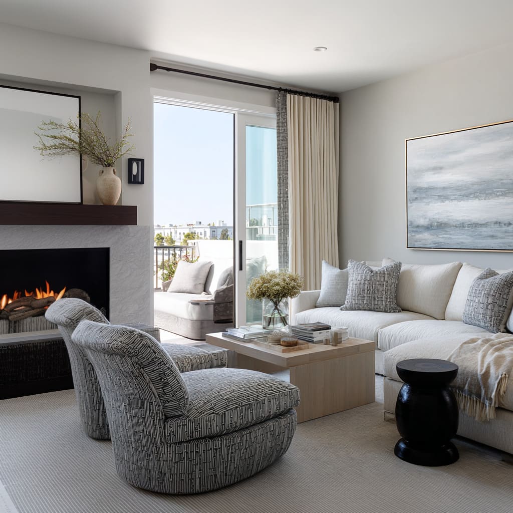 Soft coastal modern with a warm white sofa snd grey patterned swivel chair as the depth maker