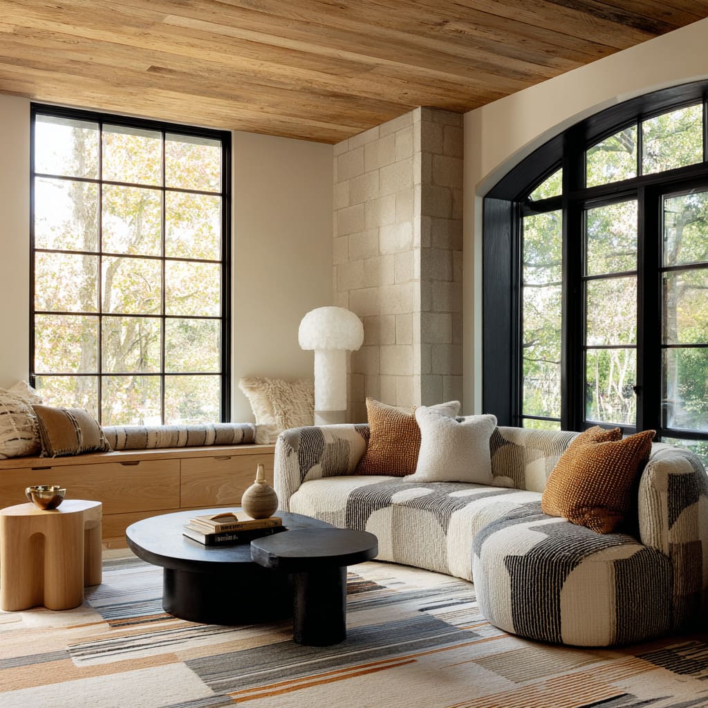 The impact comes from contrast and rhythm, not from bright hue. This works best when other pieces hold back: warm architectural materials stay present (wood, stone), and dark accents appear as a few clean silhouettes rather than scattered objects.