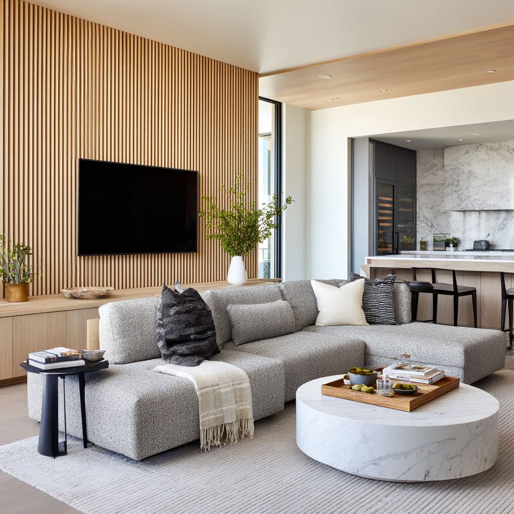 This is the quiet logic behind many light grey couch living room ideas: the room stays luminous, but it gains shape and hierarchy through mid-tone placement.